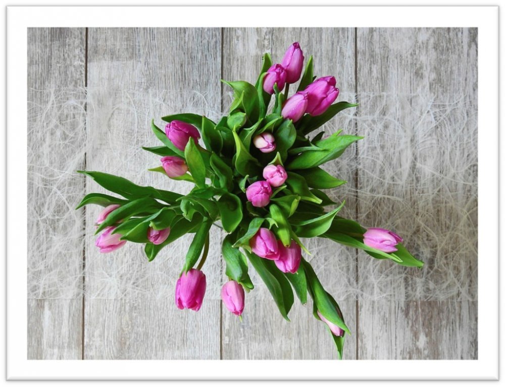 Obraz zachycuje kytici tulipánů na dřevěném pozadí. Skvěle se hodí jako dekorace do vašeho bytu, nebo domu například do obýváku, či ložnice, také například do kavárny nebo do jiných relaxačních prostor. Je vhodným dárkem k narozeninám, nebo ke kolaudaci.