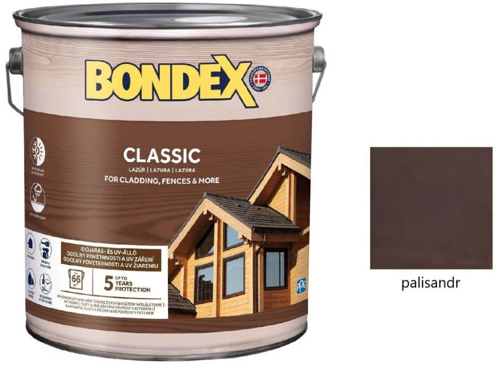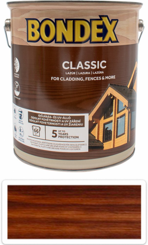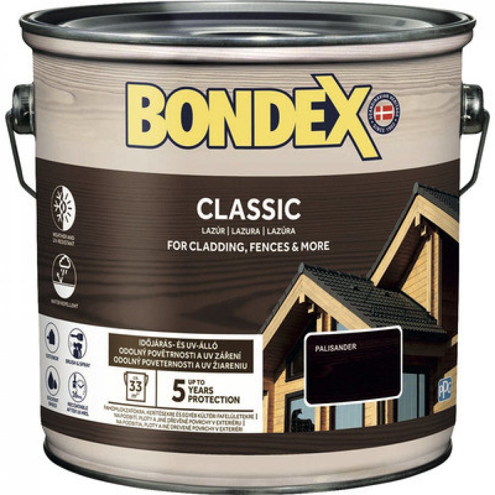 BONDEX CLASSIC tenkovrstvá syntetická lazura na dřevo je kvalitní volbou pro každého, kdo hledá spolehlivou ochranu svého dřeva před UV zářením a vyblednutím. Díky svému vysokému stupni průniku pronikne hluboko do pórů dřeva, zbarví povrch na požadovaný přírodní odstín a zvýrazní jeho přirozenou strukturu. Snižuje degradaci povrchu dřeva (šednutí) a šetří náklady na údržbu. A co je nejlepší, díky zvýšené ochraně proti UV záření se vaše dřevo bude těšit krásnému vzhledu po mnoho let. Rádi bychom Vás informovali, že došlo k změně názvu a balení produktu. BONDEX CLASSIC byl dříve známy jako BONDEX MATT. BONDEX CLASSIC tenkovrstvá syntetická lazura na dřevo je snadno aplikovatelná a vytváří hedvábně matný vzhled. Je ideální na ošetření a údržbu všech druhů dřeva a dřevěných prvků v exteriéru, včetně neopracovaného dřeva. Můžete ji použít na okna, ploty, podhledy, podbití a díky svému složení lze použít i na vysoce exponované (namáhané) povrchy - štíty, pergoly a mnoho dalších. BONDEX CLASSIC tenkovrstvá syntetická lazura na dřevo je rozhodně investicí, která se vám vyplatí. Navíc, díky svému krásnému vzhledu a vynikajícím ochranným vlastnostem, zvýší hodnotu vašeho domova a přispěje k jeho estetickému vzhledu. Výhody Odolná vůči UV záření, vodě a nepříznivému počasí Zvýrazňuje přírodní krásu dřeva Vynikající penetrační vlastnosti Prodloužený účinek, ochrana po dobu 5 let Vhodná do exteriéru Nepraská a neloupe se Hluboká penetrace Vydatnost 10 - 16 m²/l Doporučujeme aplikaci ve 2 - 3 vrstvách Neředí se, lazura je připravena k okamžitému použití Doba schnutí Při teplotě + 23°C a standardní vlhkosti 60% Suchý na dotek: po 6 hodinách Přetíratelný: po 16 hodinách. Nižší teplota a vyšší vlhkost vzduchu nebo dřeva mohou prodloužit dobu schnutí. Příprava podkladu Podklad musí být před aplikací pevný, suchý, odmaštěný, zbavený nečistot, prachu, zamodrání a plísní. Nové, neošetřené a demontované měkké dřevo musí být napuštěné bezbarvým napouštědlem. Vrstvy starých nepřilnavých nátěrů odstraňte, nátěry, které drží, zbruste jemným brusným papírem. Praskliny a trhliny vyplňte vhodným tmelem na dřevo. Původní vrstvy krycích barev odstraňte odstraňovačem starých nátěrů BONDEX. Aplikace Před použitím lazuru důkladně promíchejte. Neředí se! Aplikujte 2 - 3 vrstvy štětcem nebo air-less systémem. Mezi jednotlivými vrstvami je vhodné povrch jemně zbrousit brusným papírem. Nepoužívejte při teplotách nižších než +5°C nebo při relativní vlhkosti vyšší než 80%. Maximální vlhkost dřeva: měkké dřevo 15%; tvrdé dřevo 12%. Není vhodné pro pohyblivé povrchy. Bezbarvý odstín Bondex Classic je určen pouze do interiéru. Výsledný odstín závisí na povrchu a počtu vrstev. Znečištěné nářadí omyjte ihned po skončení prací přípravkem White Spirit. Použití Lazura je ideální na ošetření a údržbu všech druhů dřeva a dřevěných prvků v exteriéru, včetně neopracovaného dřeva. Vhodná je například na okna, ploty a palisády, obložení fasád, podhledy, podbití střech, přístřešky, pergoly a další. Primárně určena pro exteriér, ale lze použít i v interiéru. Nářadí pro aplikaci: štětec se syntetickými vlákny. Dostupné balení: 0,75 l; 2,5 l; 5 l