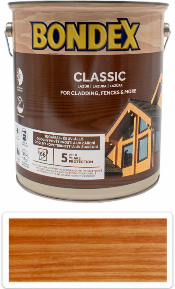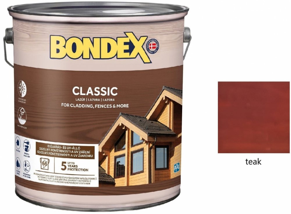 Syntetická tenkovrstvá lazura na ošetření a údržbu všech druhů dřeva a dřevěných prvků v exteriéru. Velikost balení: 5l Barva: teak Odolná vůči UV záření, vodě a nepřiznivému počasí Zvýrazňuje přírodní krásu dřeva Vynikající penetrační vlastnosti Ochrana po dobu 5 let Bondex Classic je syntetická tenkovrstvá lazura na ošetření a údržbu všech druhů dřeva a dřevěných prvků v exteriéru. Proniká hluboko do pórů dřeva, a tak poskytuje zvýšenou ochranu proti UV záření, zabraňuje vyblednutí nátěrů a vytváří povrch odolný vůči povětrnostním vlivům a vodě. Nepraská a neloupe se, snadno se aplikuje, zvýrazňuje kresbu dřeva a dodává mu hedvábně matný vzhled. Nátěrový systém v kombinaci s napouštědlem Bondex Preserve chrání daný povrch před hnilobou, dřevokazným hmyzem a houbami. Vhodná i na neopracované dřevo. Ideální na okna, ploty, podhledy nebo podbití, přístřešky, pergoly apod. Díky svému složení lze použít i na vysoce exponované (namáhané) povrchy - štíty, pergoly apod.