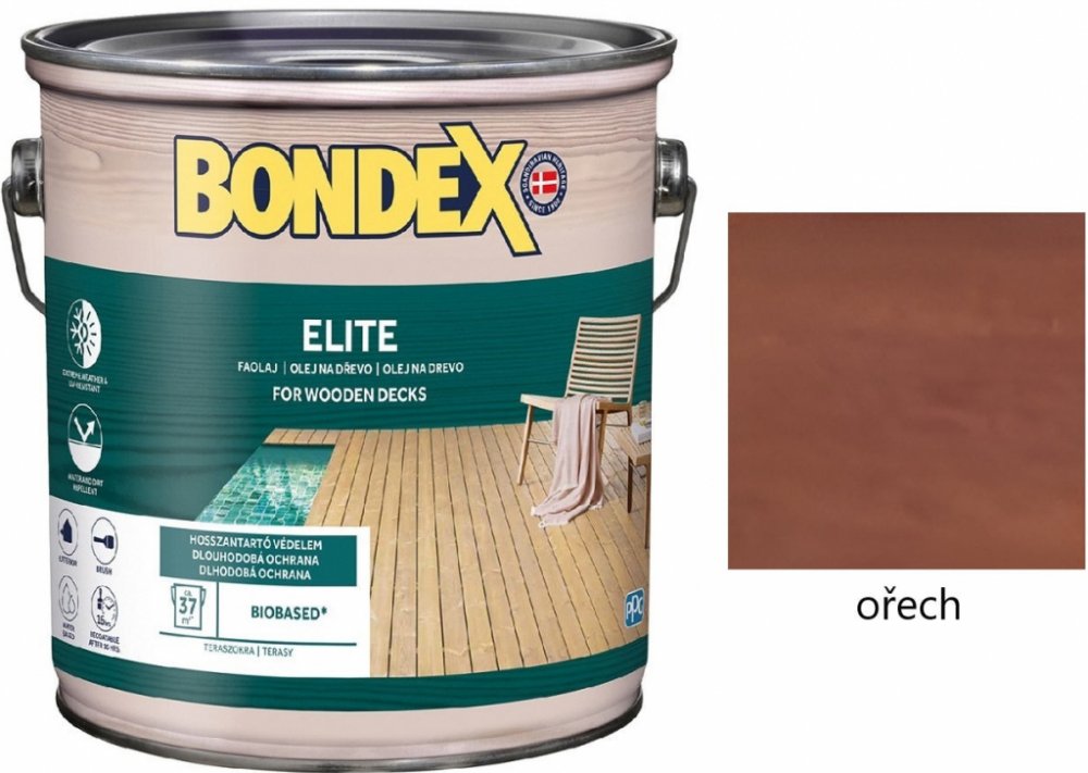 BONDEX ELITE napouštěcí olej na dřevo je extrémně odolný napouštěcí matný olej na bázi přírodních zložek s vysokou penetrační schopností pro ochranu všech druhů dřeva, zejména teras a dřevěných pochozích ploch v exteriéru. Vhodný pro nové i renovované povrchy dřevěných teras v exteriéru z měkkého, tvrdého i exotického dřeva, včetně tlakově impregnovaného a tepelně upraveného dřeva. Vstřebává se hluboko do dřeva, vytváří vodoodpudivý film na povrchu dřeva, čímž odpuzuje vodu a nečistoty a tím poskytuje extra dlouhou ochranu proti povětrnostním vlivům, UV záření a praskání. Vyznačuje se dvakrát delší trvanlivostí oproti běžným olejům. Je téměř bez zápachu a rychle schne. Primárně slouží k ochraně a zvýraznění kresby dřeva u domácího i zahradního nábytku, zábradlí a podobně. *Vyrobeno na bázi obnovitelných přírodních materiálů. *Obsah na bázi biologického zdroje: podíl 75 % organického uhlíku měřený podle normy ASTM D6866-18. Rádi bychom Vás informovali, že došlo k změně názvu a balení produktu. BONDEX ELITE byl dříve známy jako BONDEX EXTREME DECKING OIL. Výhody Dvakrát delší trvanlivost oproti běžným olejům Vynikající penetrační vlastnosti Zvýrazňuje přirozenou strukturu a kresbu dřeva Vytváří vodoodpudivý film na povrchu dřeva Vhodný pro pochozí plochy v exteriéri Vytváří matný povrch Chrání proti povětrnostním vlivům, UV záření a praskání Vhodný pro pochozí plochy Vydatnost 7 - 15 m²/l Doporučujeme aplikaci ve 1 - 2 vrstvách Neředí se, olej je připraven k okamžitému použití Doba schnutí Při teplotě + 23°C a standardní vlhkosti 60%Suchý na dotek: po 4 hodináchPřetíratelný: po 16 hodináchPlné vlastnosti: po 7 dnechNižší teplota, vyšší vlhkost vzduchu nebo dřeva mohou prodloužit dobu schnutí. Příprava podkladu Před aplikací podklad musí být pevný, suchý, odmaštěný, zbavený nečistot, prachu, zamodrání a plísní. Vlhkost dřeva nesmí překročit 16 %. Šedivé a poškozené dřevo je nutné zbrousit až na čisté a zdravé dřevo. Tlakově impregnované dřevo nelze nátírat dříve než po 6 měsících. Povrchy, které byly předtím ošetřeny syntetickým olejem, by měly být nátírány až po 2 letech, aby byla zajištěna dostatečná přilnavost. Tyto povrchy je také nutné před aplikací Bondex Elite očistit vhodným čisticím prostředkem. Nátěry exotických dřevin a smrku konzultujte s technickým oddělením PPG! Tyto dřeviny obsahují oleje a třísloviny, které mohou zpomalovat dobu schnutí, vytvářet vizuálně nedokonalý povrch a mít nedostatečnou přilnavost. Zejména smrk, cedr a podobné dřeviny očistěte nitroředidlem, zbrousíte brusným papírem (zrnitost č. 220), použijte impregnační nátěr Bondex Preserve a následně finální nátěr olejem. Aplikace Před použitím důkladně promíchejte a neřeďte. Před i během aplikace oleje důkladně promíchejte. Aplikujte štětcem nebo houbou v 1 - 2 vrstvách ve směru dřevních vláken pro dokonalé proniknutí oleje. Rozetřete spojité tahy po celé délce, aby nedocházelo ke překrývání vrstev. Dalšími nátěry se dřevo ztmavuje. Jako druhou vrstvu nebo pro obnovu nátěru můžete použít bezbarvý odstín. Přebytky oleje po aplikaci štětcem setřete měkkým hadrem nebo houbou 15 - 30 minut po aplikaci. Bezbarvý odstín nepoužívejte samostatně jako první nátěr. Nepoužívejte při teplotách pod +5 °C a při relativní vlhkosti vyšší než 80 %. Před aplikací samotného oleje proveďte zkoušku přilnavosti a barevnosti na malé ploše a zkontrolujte výsledek. Dřevo je organický materiál, a proto nelze zaručit úplně stejný vzhled na různých částech povrchu. Čištění nářadí: voda Nářadí pro aplikaci: štětec z přírodních, syntetických štětin nebo jejich kombinace, molitanová houba. Dostupné balení: 0,75 l; 2,5 l