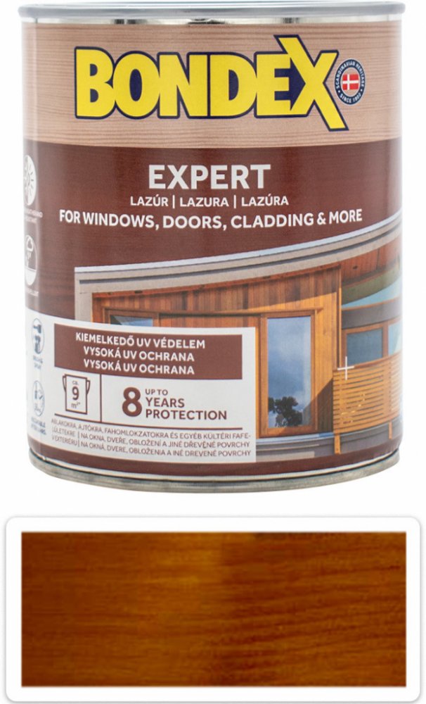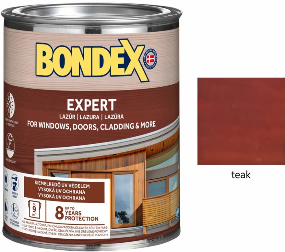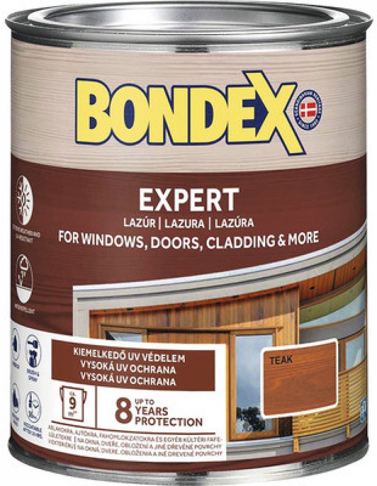 Bondex Expert je syntetická silnovrstvá lazura na ošetření a údržbu všech druhů dřeva a dřevěných prvků v exteriéru. Velikost balení: 0,75l Barva: teak Odolná vůči UV záření, vodě a nepříznivému počasí Vytváří vodoodpudivý povrch Ochrana po dobu 8 let Usnadňuje čištění a údržbu povrchu Bondex Expert je syntetická silnovrstvá lazura na ošetření a údržbu všech druhů dřeva a dřevěných prvků v exteriéru. Poskytuje dlouhodobou ochranu před UV zářením, vytváří vodu odpuzující povrch odolný vůči povětrnostním vlivům. Nepraská, neloupe se, zvýrazňuje kresbu dřeva a po každé aplikaci vytváří svěží a saténový vzhled, který se snáze udržuje a čistí. Nátěrový systém v kombinaci s napouštědlem BONDEX PRESERVE chrání daný povrch proti hnilobě, houbám a dřevokaznému hmyzu. Vhodná i na opracované řezivo. Ideální na okna, dveře, okenice, obložení apod Technický list Bezpečnostní list