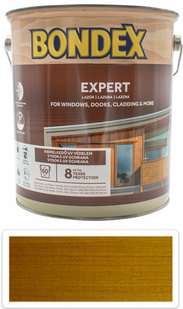 Syntetická silnovrstvá lazura Bondex Expert je určená na ošetření a údržbu všech druhů dřeva a dřevěných prvků v exteriéru. Nepraská, neloupe se, zvýrazňuje kresbu dřeva a po každé aplikaci vytváří svěží saténový vzhled, který se snadno udržuje a čistí. Chrání povrch proti hnilobě, houbám a dřevokaznému hmyzu, a to i na opracovaném řezivu. Je ideální na okna, dveře, okenice a obložení.