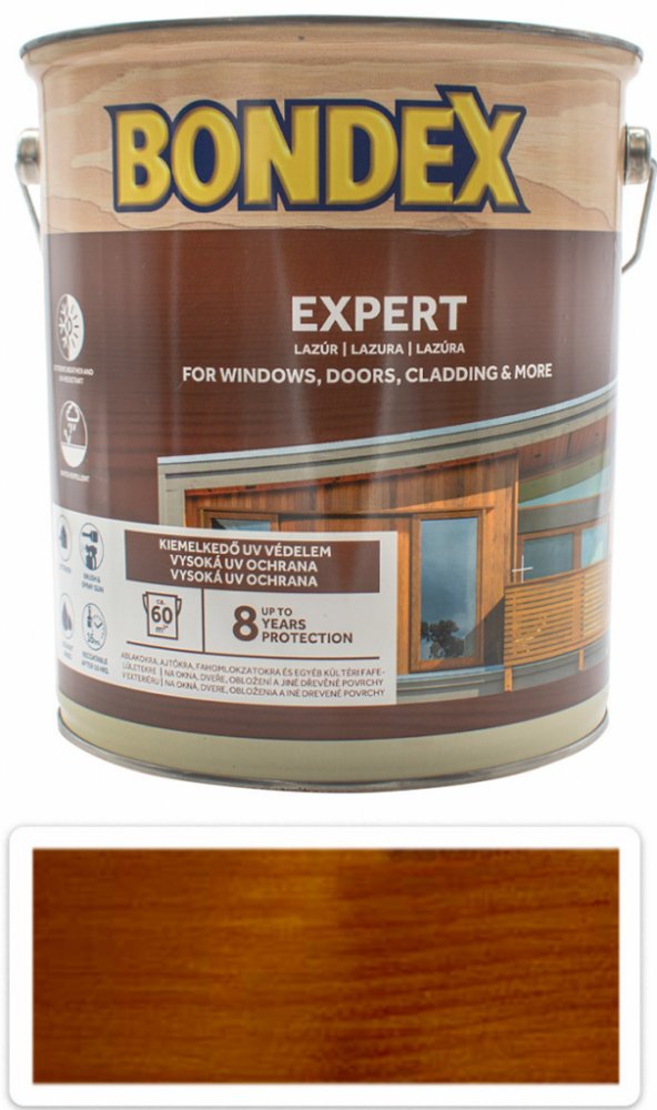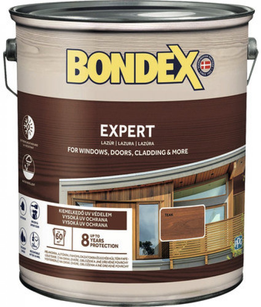 Syntetická silnovrstvá lazura Bondex Expert je určená na ošetření a údržbu všech druhů dřeva a dřevěných prvků v exteriéru. Nepraská, neloupe se, zvýrazňuje kresbu dřeva a po každé aplikaci vytváří svěží saténový vzhled, který se snadno udržuje a čistí. Chrání povrch proti hnilobě, houbám a dřevokaznému hmyzu, a to i na opracovaném řezivu. Je ideální na okna, dveře, okenice a obložení.