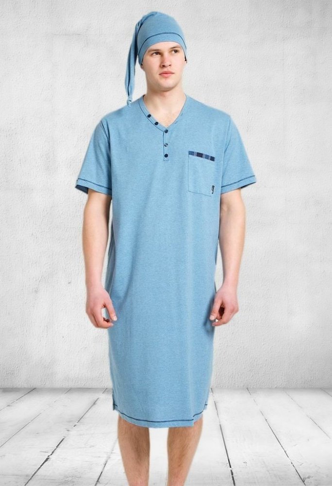 Pánská noční košile Bonifac s krátkým rukávem a čepičkou. Jednobarevnou košili zdobí barevný lem kolem kapsičky a výstřihu. Košili je možné používat i jako volné triko na doma.