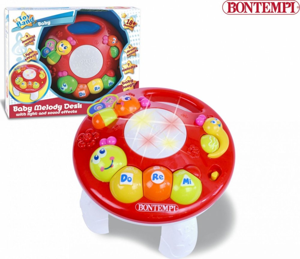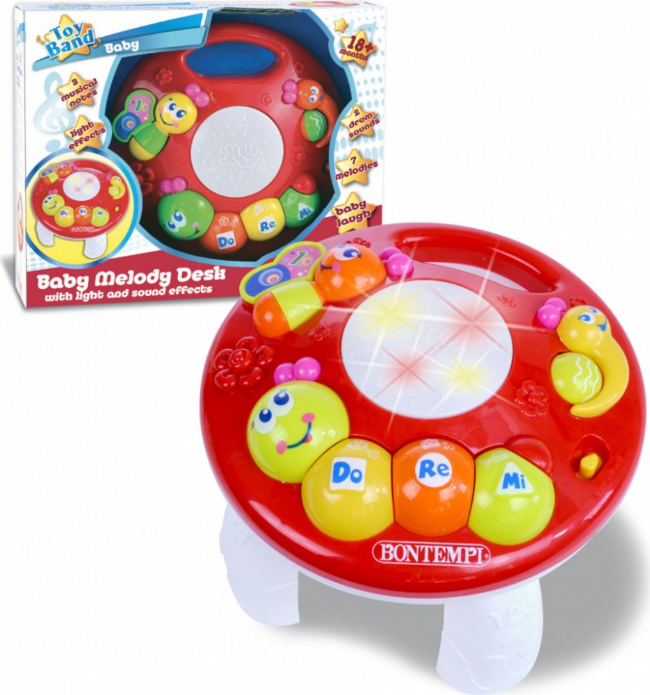 Hudební stůl pro předškoláky, který obsahuje 7 přednastavených melodií, 3 noty a 2 zvuky bicích. Po stisknutí příslušného tlačítka na stole se aktivuje smích dítěte. Můžete upravit hlasitost. Doporučený věk: od 12 měsíců Hračka je napájena 3 bateriemi AA, které nejsou součástí sady.