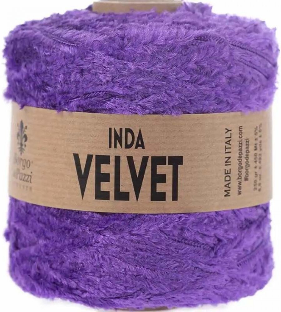 Borgo de' Pazzi Inda Velvet Fialová je prémiová příze s luxusní sametovou texturou a vysokou kvalitou. Je vyrobena z měkkého polypropylenu, který jí dodává jemný a hladký povrch. Díky své flexibilitě a pevnosti je ideální pro různé řemeslné projekty, včetně háčkování a pletení.