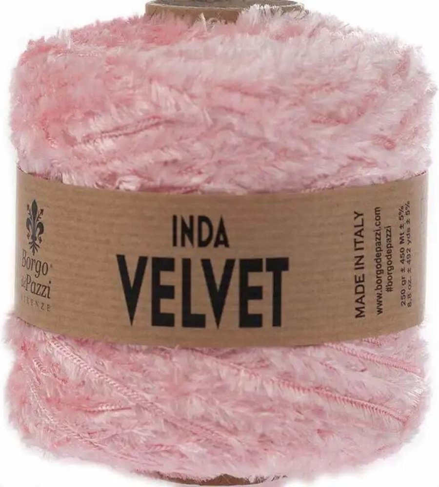 Borgo de' Pazzi Inda Velvet Světle růžová je prémiová příze s luxusní sametovou texturou a vysokou kvalitou. Je vyrobena z měkkého polypropylenu, který jí dodává jemný a hladký povrch. Díky své flexibilitě a pevnosti je ideální pro různé řemeslné projekty, včetně háčkování a pletení.