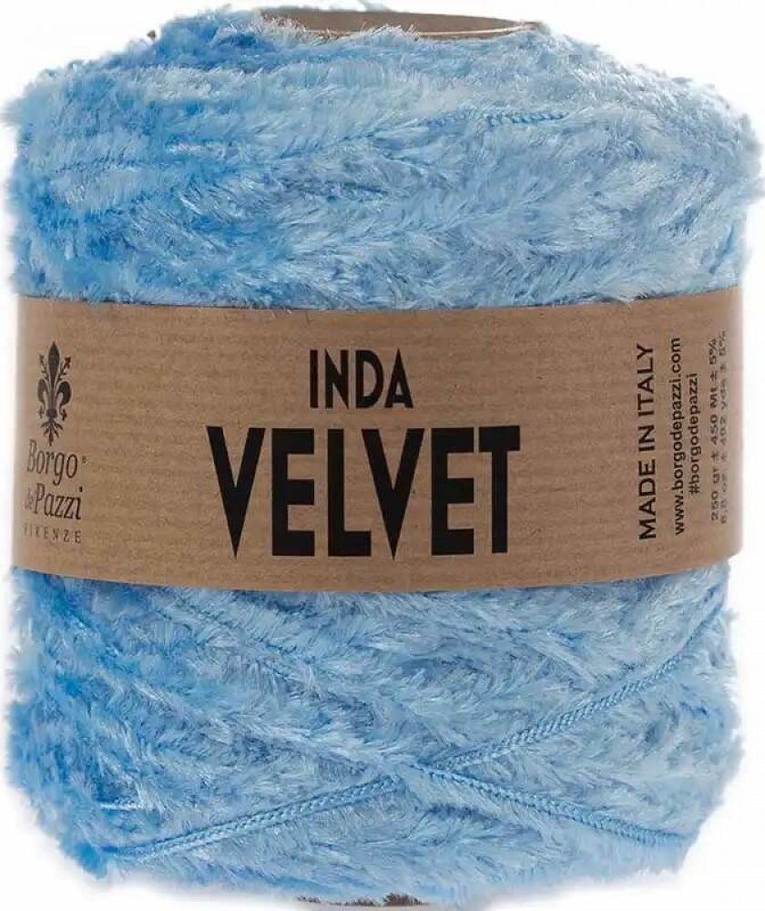 Borgo de' Pazzi Inda Velvet Světle modrá je prémiová příze s luxusní sametovou texturou a vysokou kvalitou. Je vyrobena z měkkého polypropylenu, který jí dodává jemný a hladký povrch. Díky své flexibilitě a pevnosti je ideální pro různé řemeslné projekty, včetně háčkování a pletení.