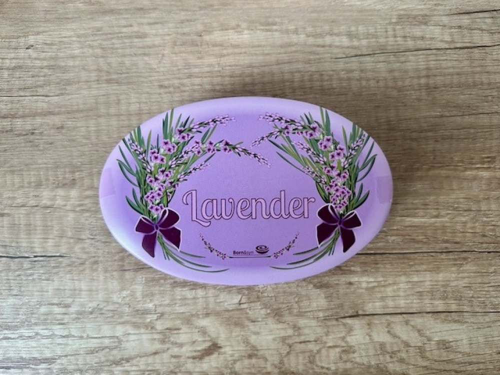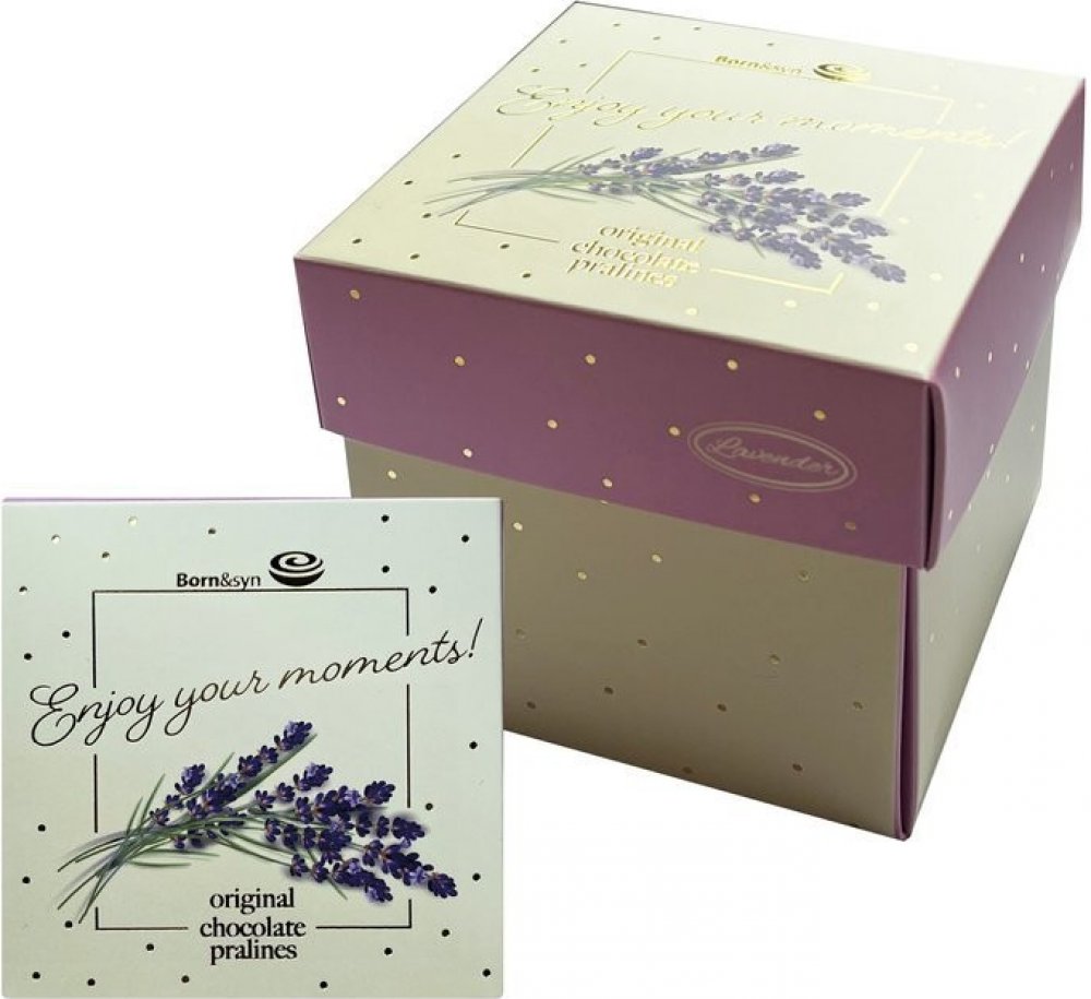 Bonboniéra od Born Syn obsahuje pralinky z mléčné čokolády plněné latte krémem. Pralinky jsou uložené v krychličce s designem levandule