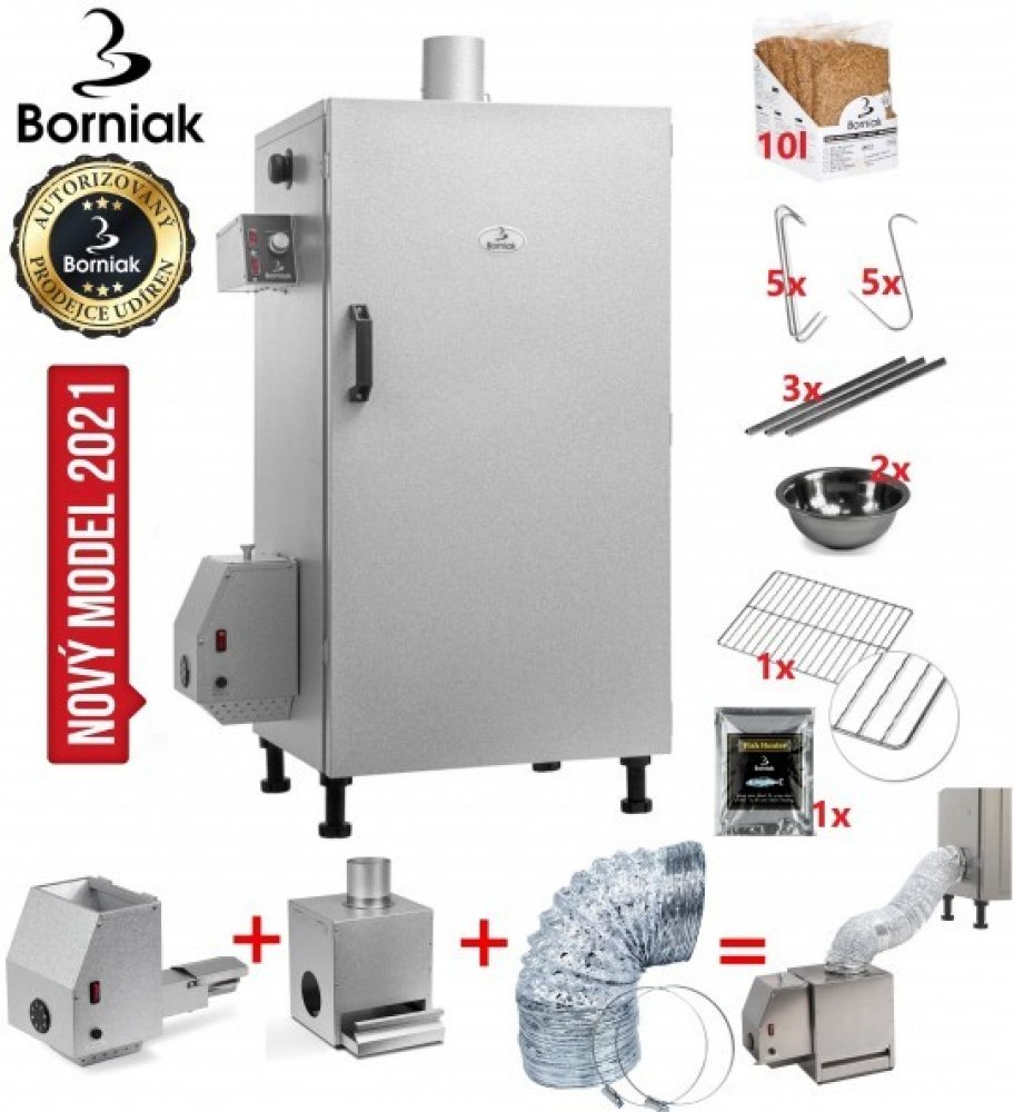 Digitální řada udíren s automatickým generátorem kouře na dřevěnou štěpku, s novým jednodušším elektronickým ovládacím panelem ( nově se zásuvkou pro vysoušeč ), adaptérem kouře a sedmi policemi pro udící rošty.
