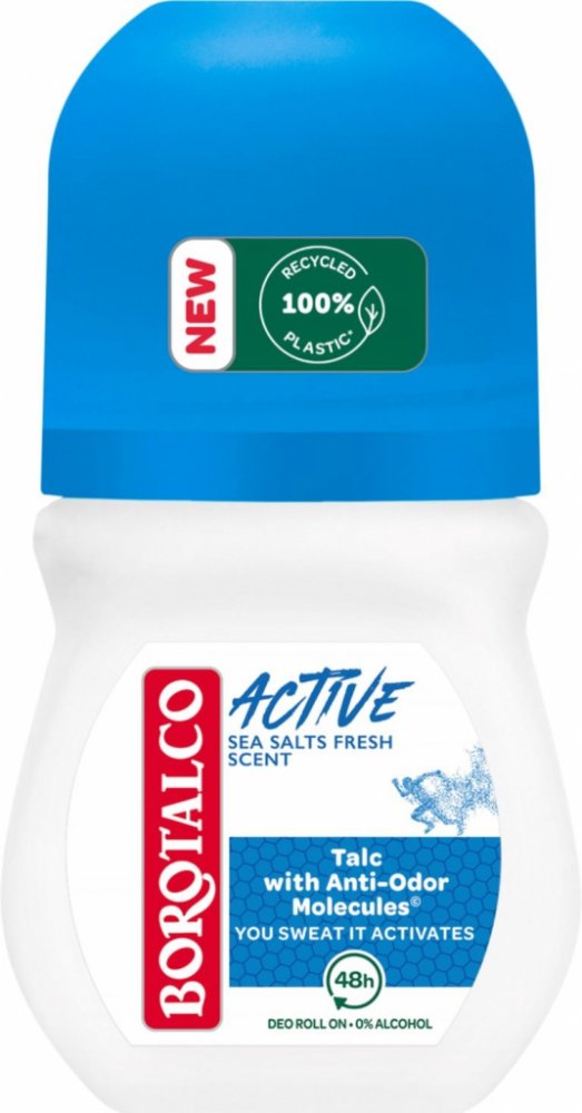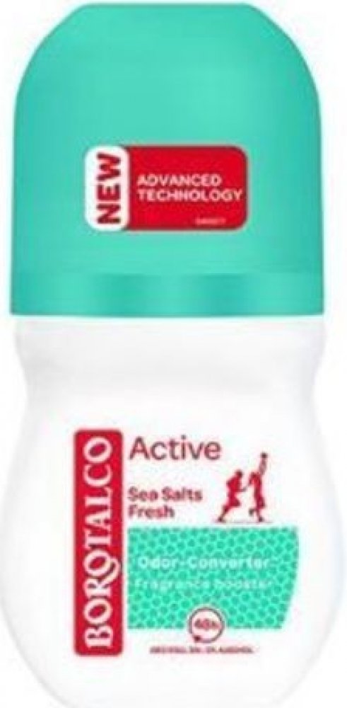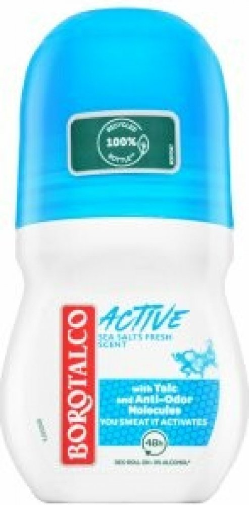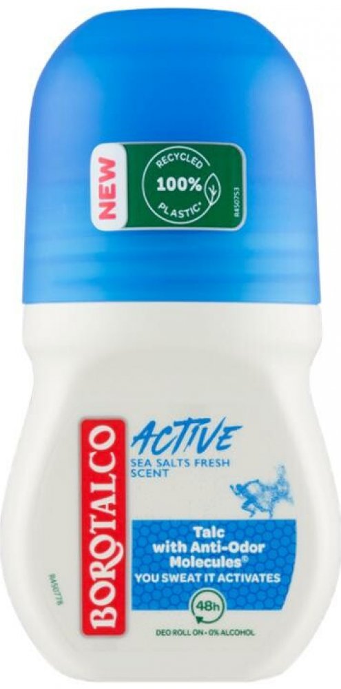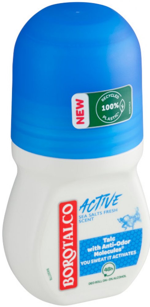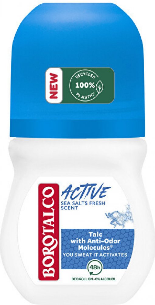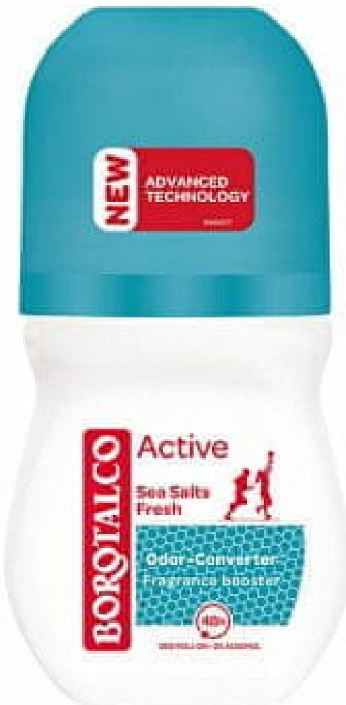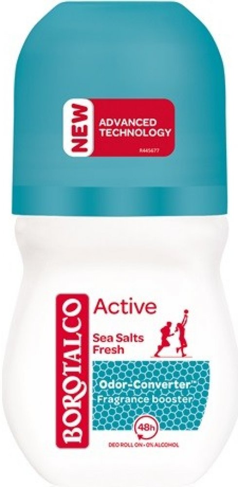 Borotalco roll-on Active Sea Salts Fresh byl vyvinutý speciálně za účelem redukce vzniku žlutých skvrn na světlých látkách a bílých stop na tmavých látkách. Díky svému složení, pohlcujícím pot, reguluje deodorant pocení a denně zajišťuje suchou pokožku.