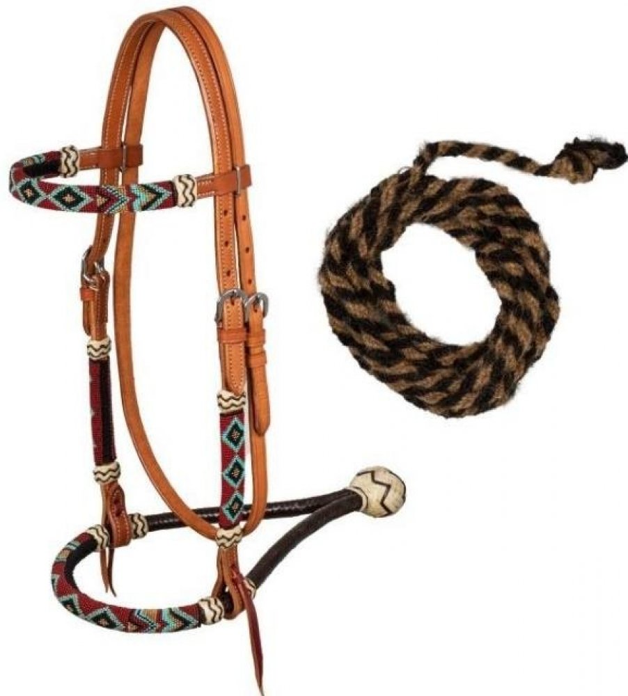 Set bosalu obsahuje uzdečku z měkké kůže a otěže Mecate z koňských žíní. Uzdečka je vybavena nerezovými přezkami, které zajišťují pevnost a stabilitu během celého používání, a korálkovou dekorací pro jedinečný elegantní vzhled. Otvory v přezkách jsou oválné, což usnadňuje přesné nastavení velikosti.