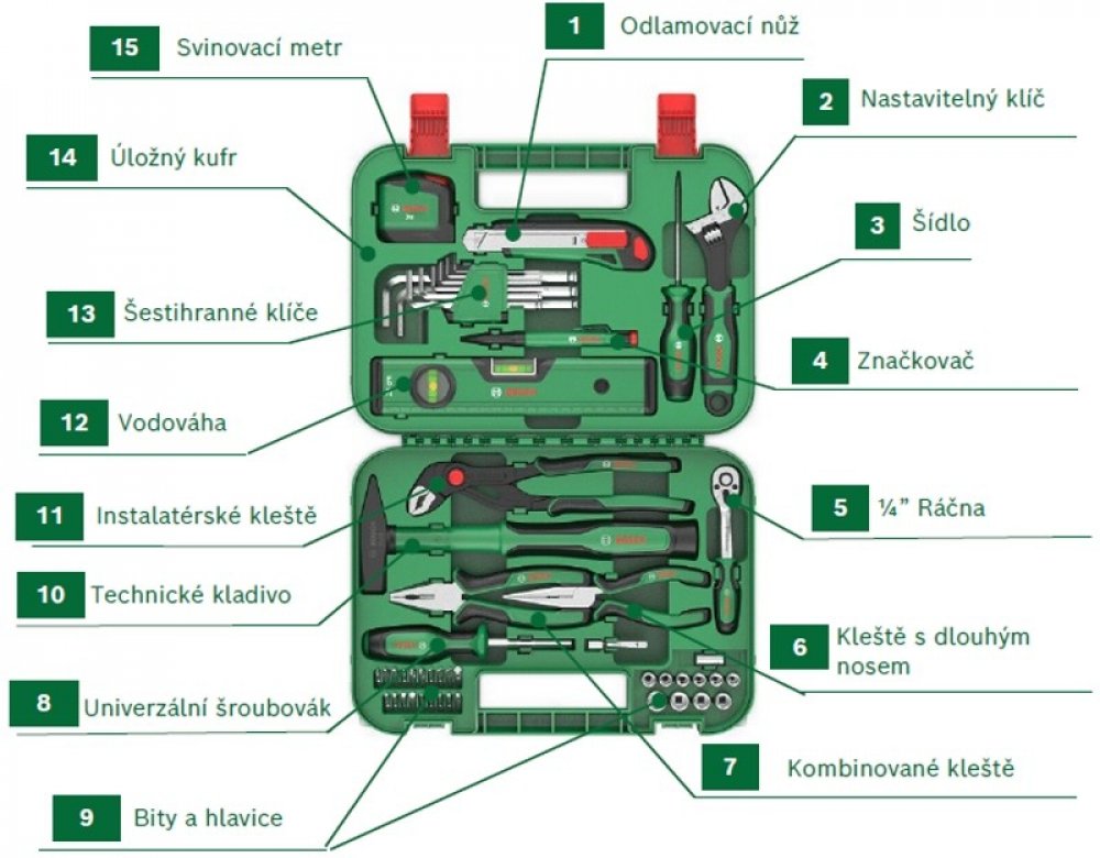 - Obsahuje několik kleští, ráčnu, šroubovák, klíč, šestihranné klíče a další