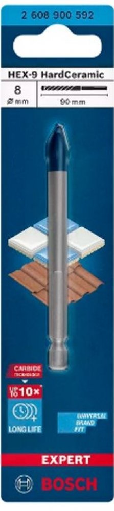 Vrták Bosch EXPERT HEX-9 HardCeramic je určen pro vrtání do dlažby a dokáže vrtat otvory do tvrdých dlaždic bez použití maziva nebo chladiva.
