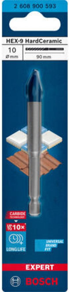 Vrták Bosch EXPERT HEX-9 HardCeramic je určen pro vrtání do dlažby a dokáže vrtat otvory do tvrdých dlaždic bez použití maziva nebo chladiva.