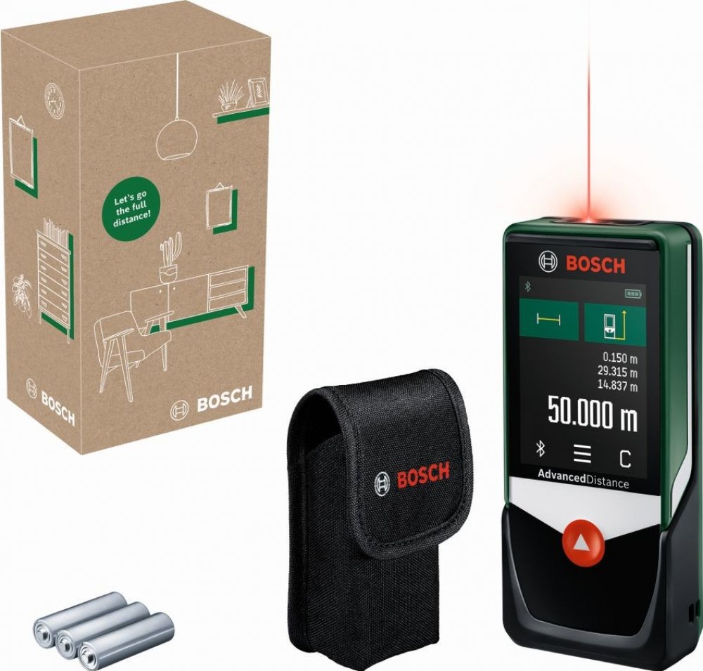 Digitální laserový dálkoměr (Metr) Bosch AdvancedDistance 50 C Chytřejší způsob měření Přesné laserové měření až do vzdálenosti 50 m Ovládací prvky na dotykovém vysoce kvalitním barevném displeji pro optimální ovládání a čitelnost Integrované standardní měřicí funkce včetně nepřímého měření Animované podrobné pokyny ke každé funkci Připojení přes Bluetooth pro přenos výsledků do aplikace Bosch Nabízí prvky udržitelnosti, další informace naleznete níže Chytré plánování začíná s AdvancedDistance 50C. Je vybaven intuitivní dotykovou obrazovkou a jeho integrované funkce okamžitě změří délku a vypočítají plochu i objem. To se hodí zejména při výběru nábytku do konkrétního prostoru či určení množství barvy nebo podlahových krytin potřebného pro danou práci. Tento přístroj dokáže přičítat či odečítat výsledky, zobrazovat úhel sklonu a i nepřímo měřit až do vzdálenosti 50 m, i když laserovou čáru blokuje nějaký předmět, například nábytek. Všechny údaje lze odesílat do aplikace Bosch pro digitální dokumentaci či plánování projektu, zajistit si tak úsporu času a předcházet chybám. Funkce: Připojení Bluetooth - Připojení přes Bluetooth umožňuje snadný přenos výsledků měření do aplikace Bosch pro pohodlnou a bezchybnou dokumentaci. Měření i přes překážky - AdvancedDistance 50C v případech, kdy není možné přímé měření, např. když chybí referenční body nebo dráhu laseru blokuje nějaký předmět, využívá k nepřímému výpočtu vzdáleností a výšek úhlové měření. Přesné měření stisknutím tlačítka - Integrované funkce měří délku, vypočítají plochu i objem. Mezi další funkce patří přičítání a odečítání naměřených hodnot a průběžné měření s možností min./max., která umožňuje vyhledání nejkratších a nejdelších vzdáleností. Vysoce kvalitní dotykový displej s praktickými animacemi - Intuitivní vysoce kvalitní dotyková obrazovka zahrnuje integrovanou nápovědu, která pomocí animací vysvětluje jednotlivé měřicí režimy. Snadné ovládání – pomocí intuitivní dotykové obrazovky nebo jednoduchých aplikačních tlačítek - Usnadněné ovládání – intuitivní dotyková obrazovka nebo jednoduchá aplikační tlačítka nabízejí vedení každou úlohou od začátku až do konce. Snadný přístup k uloženým naměřeným hodnotám - Kromě tří naposledy naměřených hodnot na displeji přístroj umožňuje manuální uložení dalších 10 výsledků pro pozdější dohledání. Laserová přesnost pro rychlé měření vzdáleností - Měření vzdáleností s přesností – precizní výsledky při měření výšek a délek díky laserové technologii Bosch. Rozsah dodávky: 3× baterie 1,5V LR03 (AAA) Měkká úložná brašna Karton eCommerce Udržitelnost Produkt a příslušenství: Kryt - vyroven z > 85 % z recyklovaného plastu (Všechny díly viditelné zvenku kromě baterie a příslušenství). Pouzdro - Vyrobeno z > 80 % z recyklovaných materiélů (Všechny části, ze kterých se skládá brašna na přenášení produktu) Balení : Kartonový obal - Vyroben z > 90% z recyklovatelných vláken (Všechny části, ze kterých se skládá balení produktu a které jsou vyrobeny z papírových vláken). Uživatelská příručka a ůleták - Jsou vyrobeny ze 100 % z recyklovatelných vláken (Balení bez igelitových sáčků, Všechny části, ze kterých se skládá balení produktu a které jsou vyrobeny z papírových vláken)