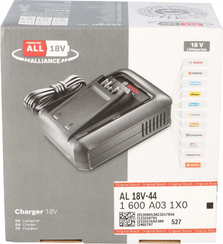 Nabíječka AL 18V-44 je prakticky kompatibilní - nabíjí všechny akumulátory ze systému 18V POWER FOR ALL Home & Garden. Nabíječka disponuje funkcí rychlonabíjení a například akumulátor s kapacitou 4,0 Ah nabije už za cca 59 min. Integrovaný nástěnný držák a gumové nožičky zaručují bezpečné umístění na všechny podklady. Akumulátorový systém POWER FOR ALL od firmy Bosch Vrtání, čištění či zahradničení. Rychlé a snadné přechody mezi jednotlivými zařízeními s akumulátorem 18 V POWER FOR ALL od firmy Bosch. Pro ještě větší flexibilitu akumulátor sedí i na nářadí od partnerů se systémem POWER FOR ALL. Technické parametry: - Nabíjecí napětí akumulátoru: 14,4-18 V - Nabíjecí proud: 4,4 A - Doba nabíjení při 2,0 Ah 100 % cca: 34 min - Doba nabíjení při 2,5 Ah 100 % cca: 44 min - Doba nabíjení při 4,0 Ah 100 % cca: 59 min - Doba nabíjení při 6,0 Ah 100 % cca: 87 min - Napětí akumulátoru: 18,0 V - Kompatibilita akumulátoru: 18V POWER FOR ALL ALLIANCE - Rozměry (D x Š x V): 153 x 109 x 81 mm - Hmotnost: 0,475 kg