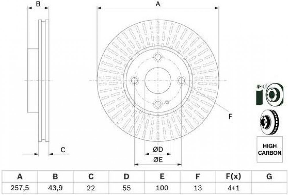 Technické parametry:Vnější průměr [mm]: 257,5Síla brzdového kotouče [mm]: 22Minimální tloušťka [mm]: 20Výška [mm]: 43,9Kruhový vyvrt Ø 2 [mm]: 100Typ brzdového kotouče: větránoCentrovací průměr [mm]: 55Počet děr: 4Povrch: nátěrZpracování: vysoce nauhličenoSplňuje ECE-normu: ECE-R90Průměr vývrtu do [mm]: 13OEM číslo::Aftermarket: BG4942C, DF8181, DF8181, DF6793, DF6793, 563385JC1, 563324JC, DDF2861...