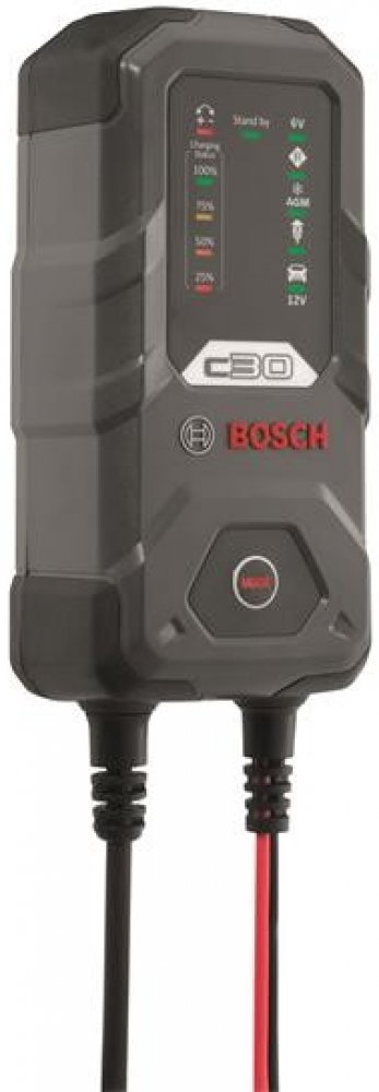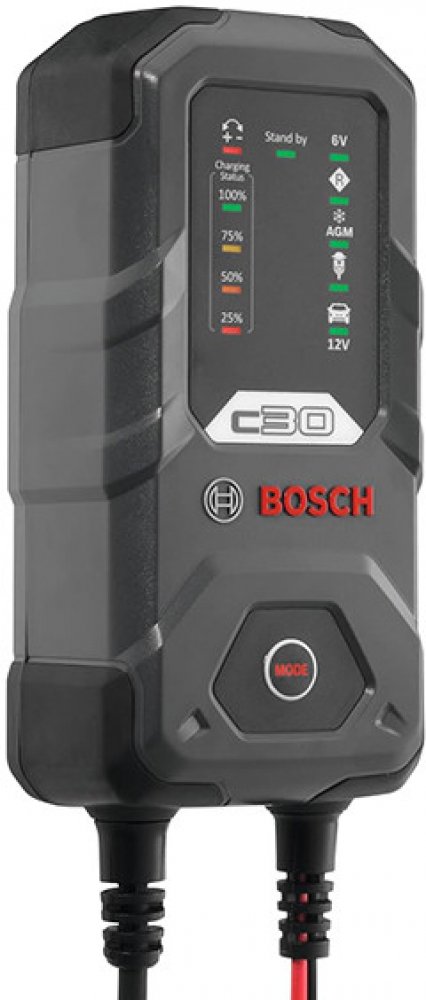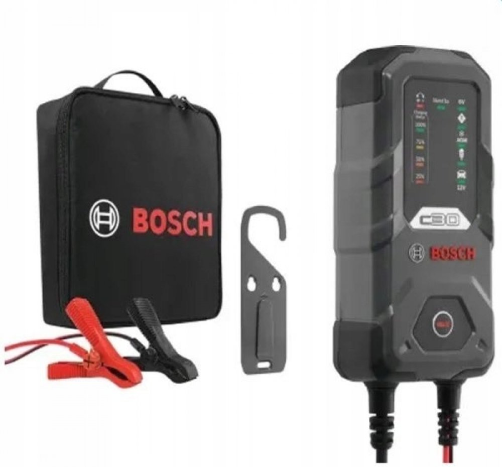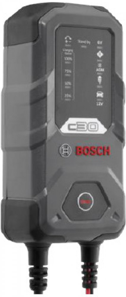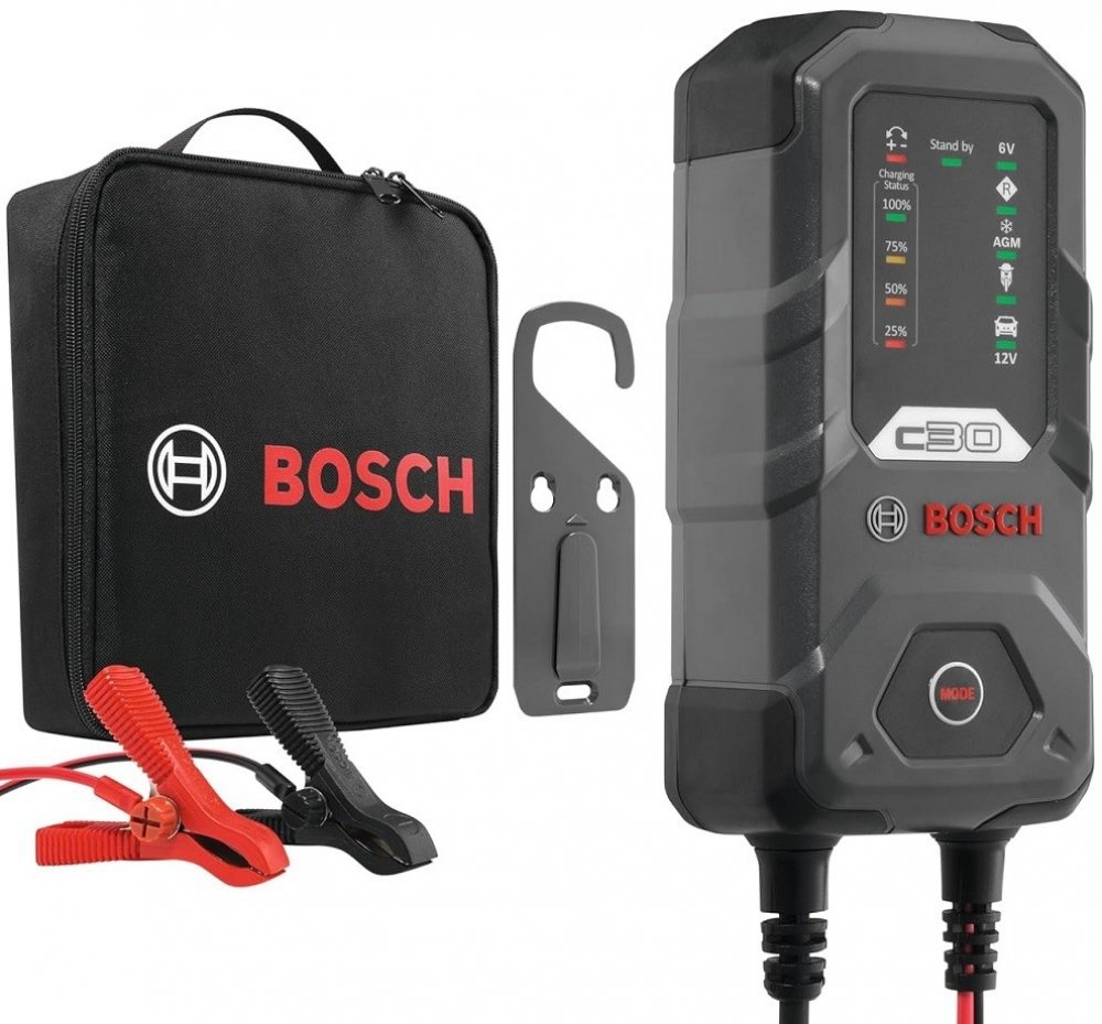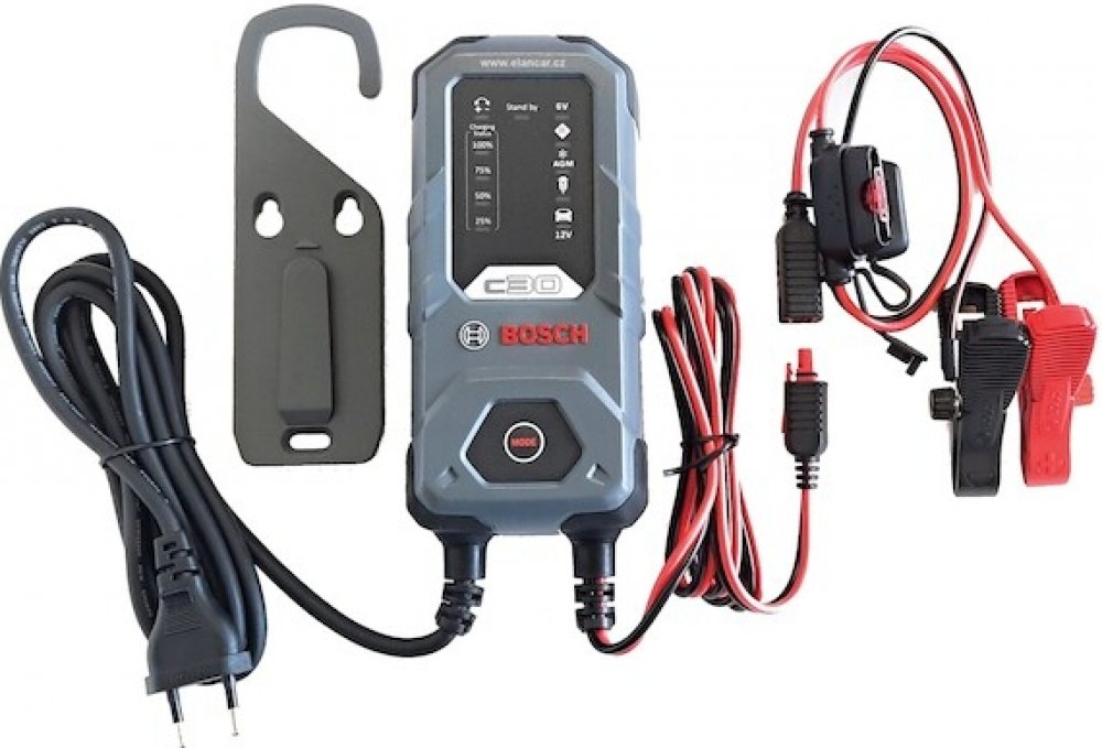 Nabíječka BOSCH C30 je automaticky řízená mikroprocesorem MCU. Ovládání je jednoduché a intuitivní díky dobře čitelnému ukazateli. Umožňuje znovunabití baterie téměř až na 100% její kapacity. Je bezpečná díky ochraně proti přepólování a přehřátí.