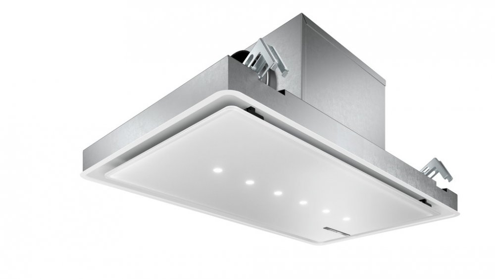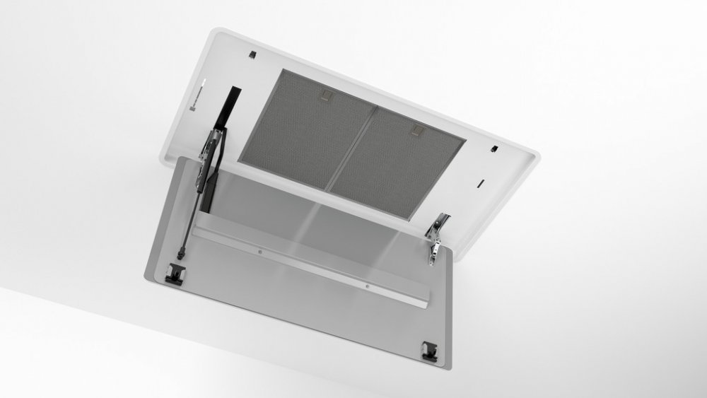 Integrovaná stropní odsavač: prostorově úsporné řešení pro perfektní instalaci v otevřené kuchyni přímo do stropu.