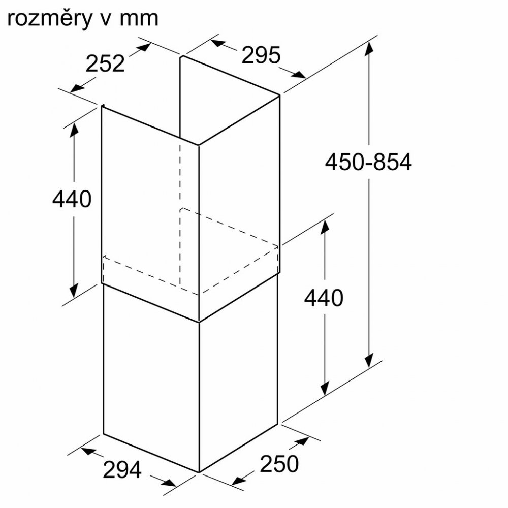 Příslušenství pro odsavače par, 450-854 mm, Černá DWZ1IB6K1 Zvláštní příslušenství - Prodloužení komínu 450-854 mm pro vestavný designový odsavač par- dvoudílná komínová sada pro individuální výškové nastavení v nástěnné skříňce- použitelné pro provoz s odvětráváním i cirkulací vzduchu- prosím, postupujte dle rozměrů uvedených v instalačním výkresu