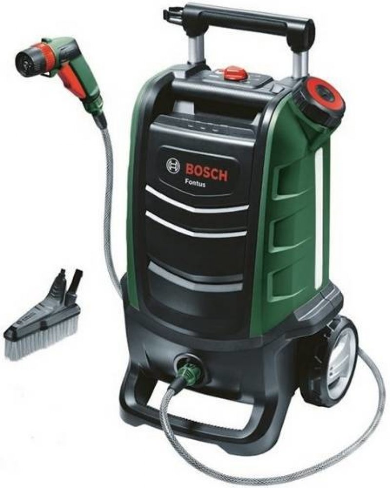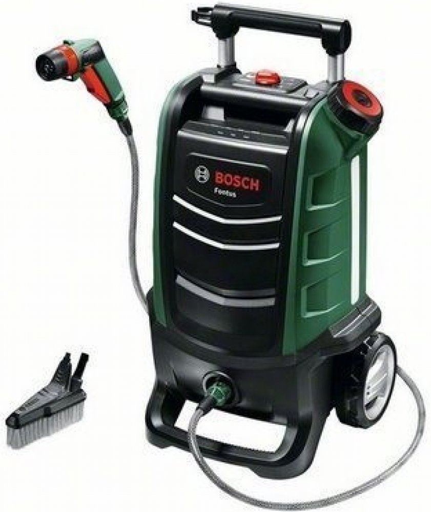Aku vysokotlaký čistič Fontus od značky Bosch lze používat na cestách bez ohledu na připojení k napájení nebo vodě. Čtyři různé tvary proudu a nastavitelný tlak vody umožňují individuální použití – bodový proud pro odolné nečistoty, 15° vějířový proud pro přesnost na menších plochách, 50° vějířový proud pro stříkání větších ploch a sprchový proud pro jemné čištění. Vyčistí i větší předměty, jako je zahradní nábytek, vozidla a jízdní kola. Fontus má nový přívod vody z vodovodu a integrovaný vodní filtr pro nepřetržitou práci. Připojitelný kartáč SmartBrush je ideální pro čištění oken a jízdních kol. Uskladnění příslušenství a uložení pistole během používání činí čištění ještě pohodlnějším. Součástí dodávky je 4m hadice, stříkací pistole, vodní filtr a kartáč. Akumulátor a nabíječka součástí nejsou.