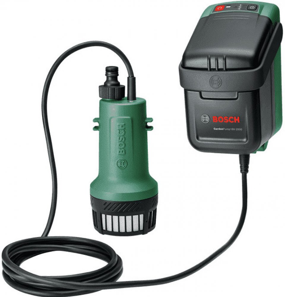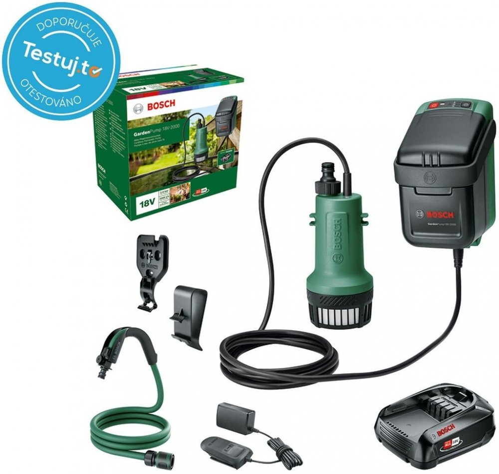 Čerpadlo Bosch GardenPump 18V-2000 (1x2,5 Ah)Přínosné pro životní prostředí a prospěšnější pro rostliny – akumulátorové čerpadlo GardenPump 18 funguje lehce na všechny typy zahradních nádrží na dešťovou vodu a zajišťuje rychlejší a efektivnější zalévání zahrady. Začněte nastavením akumulátorové řídicí jednotky, kterou lze pohodlně zavěsit na nádrž nebo připevnit ke zdi. Poté jednoduše ponořte čerpadlo na dešťovou vodu do nádrže. Dále připojte zahradní hadici o délce až 25 m a stříkací pistoli. Toto čerpadlo na dešťovou vodu je perfektní na přírodní a příjemnější zalévání záhonů s květinami i ovocem a zeleninou či květináčů. Pro dokonale zelený trávník použijte funkci časovače, kterým je tento přístroj vybaven, a přípojku proti zpětnému nasávání s rozprašovacím a závlahovým systémem. Tlačítko s funkcí časovače se třemi různými dobami zalévání je ideální pro použití se systémy na zalévání a zavlažování trávníku. Bezpečnostní víko zůstává během používání na místě, kdy se odpojí kabel spojující čerpadlo na dešťovou vodu a akumulátorovou řídicí jednotku a protáhne se přístupovým otvorem nádrže. Díky kabelu o délce 2,5 m je čerpadlo vhodné i do větších nádrží s hloubkou až 1,8 m. Přípojka proti přečerpání po vypnutí čerpadla do vypouštěcí hadice automaticky natáhne vzduch, aby se předešlo přečerpání.