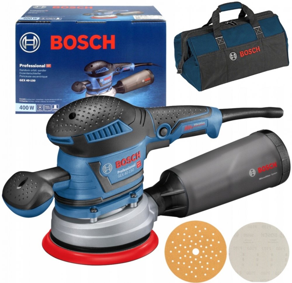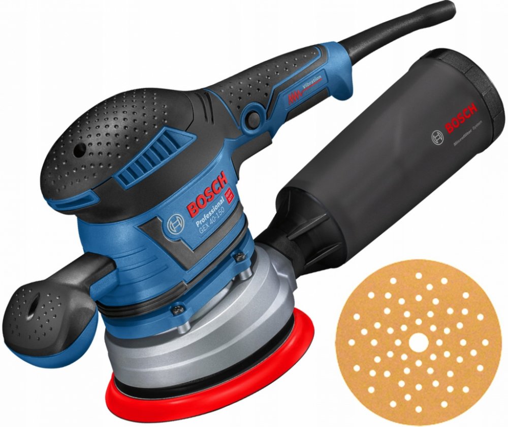 GEX 40-150 Professional je kabelová excentrická bruska Bosch navržená pro vysoký výkon při profesionálních povrchových úpravách v kategorii 150 mm. Oddělená konstrukce motoru a brusné jednotky pro stálý přítlak a poskytuje nejkvalitnější výsledky práce. Její jedinečné tlumení vibrací produkuje velmi nízké vibrace, což umožňuje nepřetržitou práci. Předvolba rychlosti umožňuje různé aplikace s různými materiály. Tato excentrická bruska je určena k broušení, mezibroušení, odstraňování laku, dokončování povrchů a leštění. Je použitelná na dřevo, dýhu, lak a plnivo, minerální i akrylové. Je kompatibilní se systémem odsávání prachu Bosch Click & Clean.