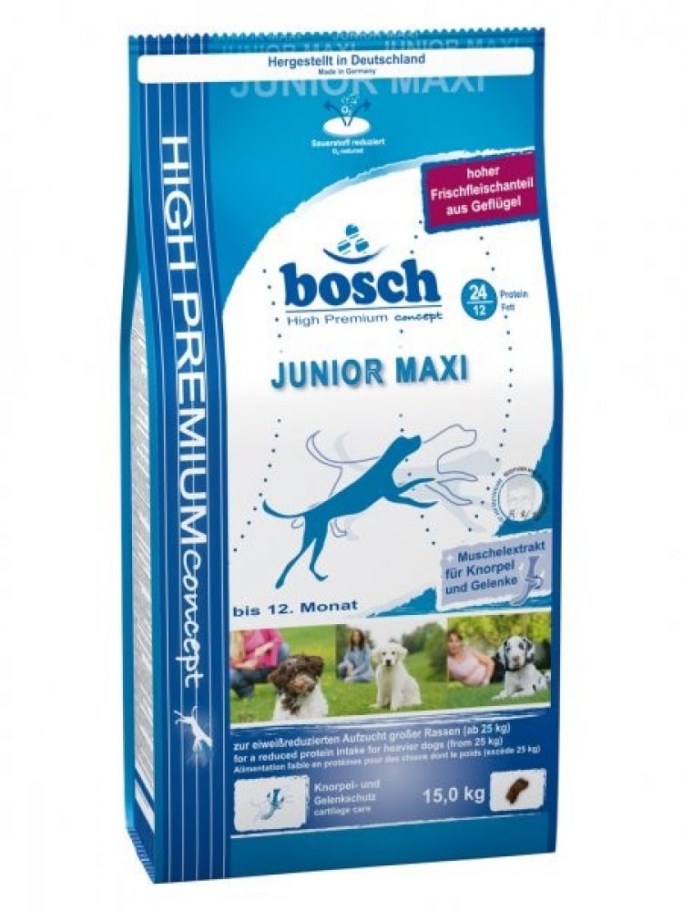 Bosch Junior Maxi je krmivo pro odchov štěňat velkých a velmi velkých ras a proto je obsah energie a bílkovin snížen. Snížený obsah energie a bílkovin pomáhá docílit rovnoměrný růst, štěňata nerostou příliš rychle, což je důležité pro ochranu kloubů. Právě u štěňat velkých ras je lepší pomalejší tempo růstu, než příliš rychlý nárůst váhy. Velké, speciálně formované krokety nutí k intenzivnějšímu kousání a nedochází tak k hltání krmiva, které může způsobit problémy. Bosch Junior Maxi se hodí výborně jako navazující krmivo na Bosch Puppy, může být ale podáváno již v období po odstavu.
