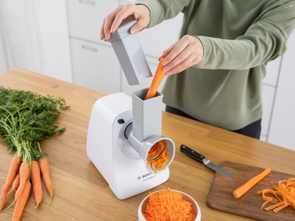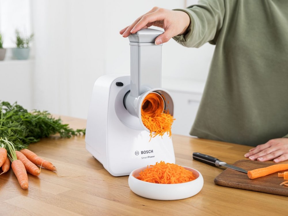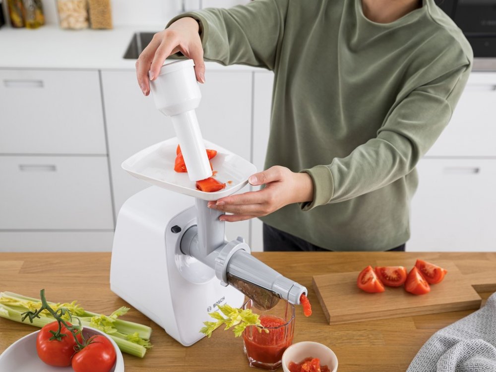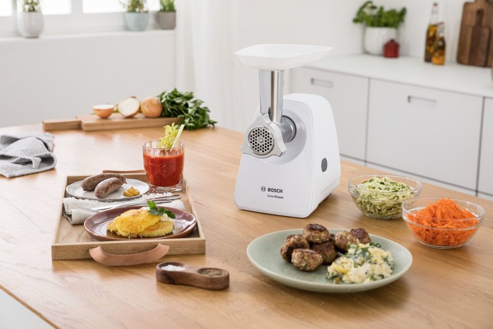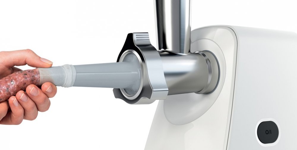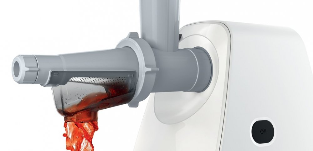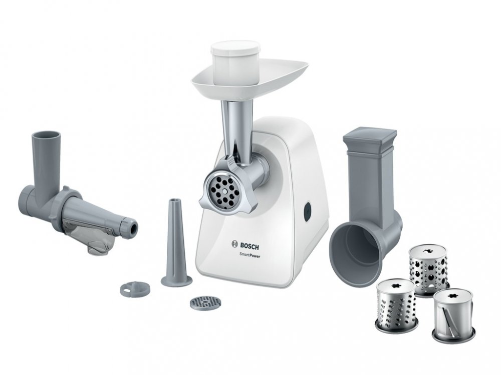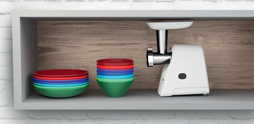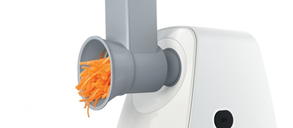 Silný motor: 1500 W Motor Block Power; rovnoměrně zpracuje maso ve velmi krátkém čase. Nástavec na klobásy/párky, struhadlo se 3 bubny, nástavec na lisování ovoce.
