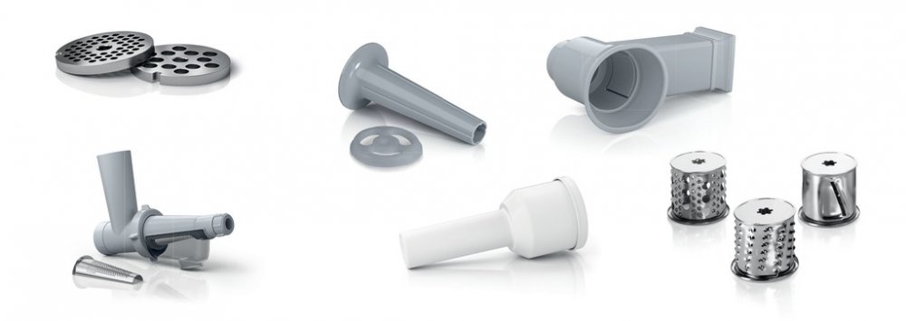 Nástavec: hrubé mletí; jemné mletí; lis na ovoce; plnění uzenin; strouhání