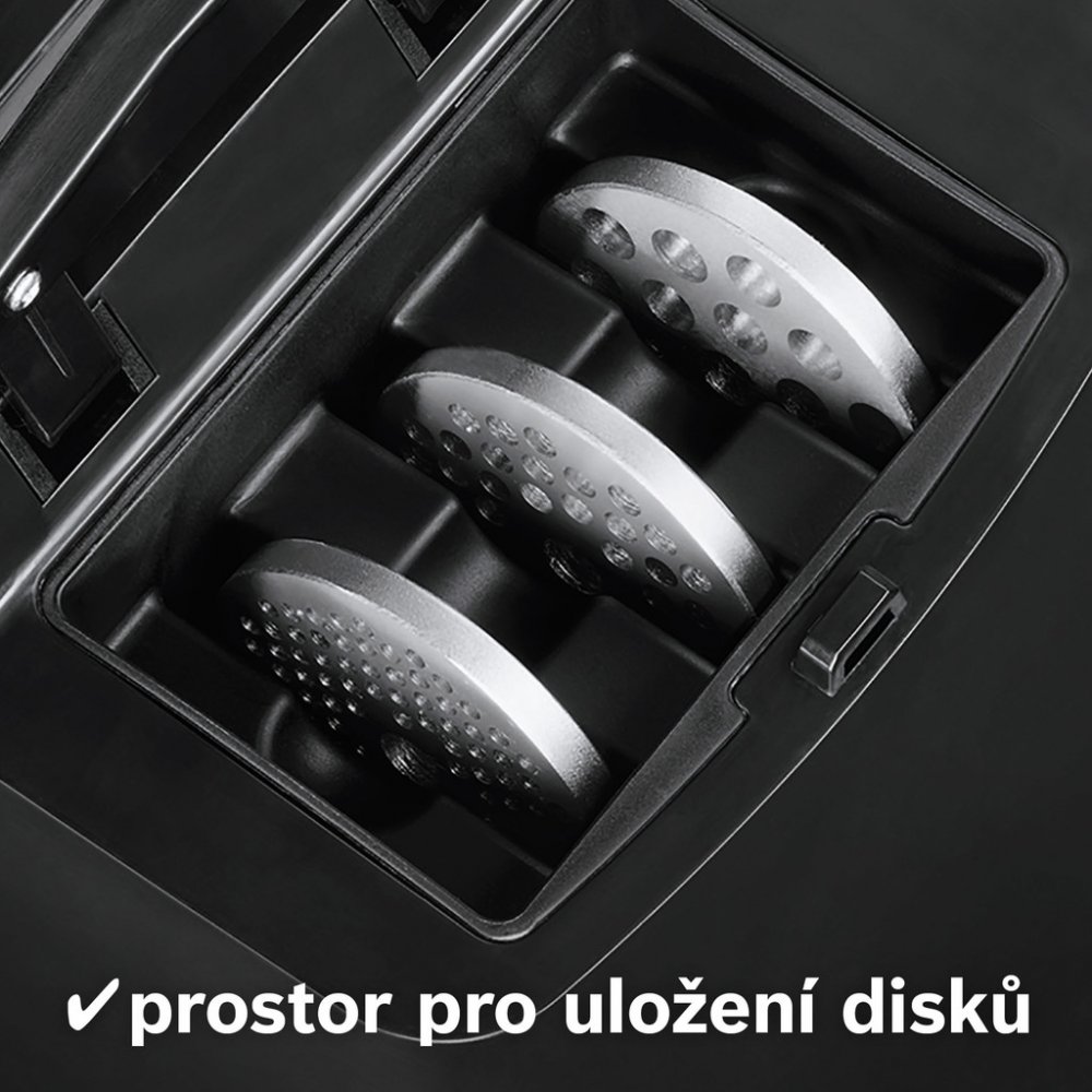Snadná manipulace díky praktickému držáku, uskladnění kabelu a přihrádce na disky.