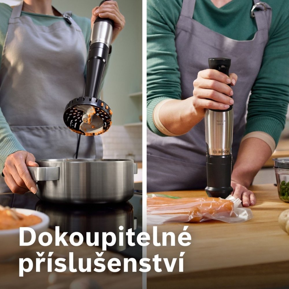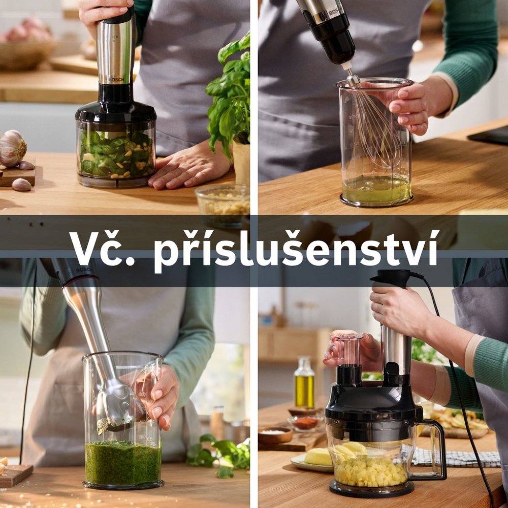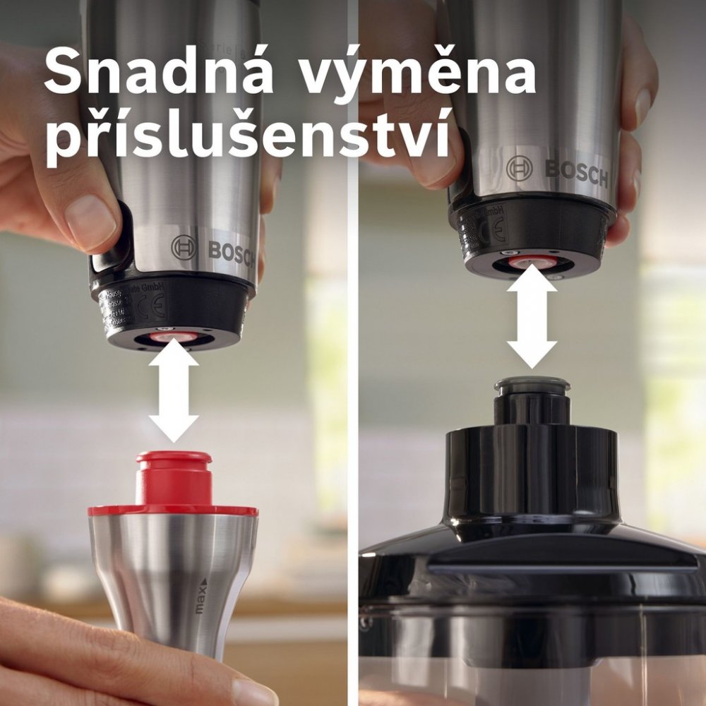 Select brand: TYČOVÉ MIXÉRY BOSCH/tycove-mixery/bosch/18850454-v1877.htmBOSCH MSM6M8X1Mixuje, drtí, seká, míchá, šlehá. Tak všestranný je designový tyčový mixér BOSCH MSM6M8X1. Silný 1200W motor s novým chlazením se nezalekne ani těch nejtvrdších ingrediencí, avšak s lehkostí zpracuje i tu nejnadýchanější šlehačku. Vyniká keramickou pojistkou, která zajistí vynikající výkon. Mixér díky ergonomickému zpracování skvěle padne do ruky a zajistí méně únavy pro ruku a lepší citlivost při ovládání výkonu. Nabízí plynulou regulaci rychlosti. Mixér je vybaven unikátním QuatrroBlade Systém Pro. Usnadněte si vaření s výrobky značky BOSCH vyrobené ve Slovinsku!Proč právě tyčový mixér BOSCH MSM6M8X1Vysoký výkon 1200W motoru Bosch:pro zpracování i těch nejtvrdších ingrediencí a s možností využít nejrůznější příslušenství.Patentovaný „Click-mechanismus“ značky Bosch:pomáhá jednoduše připojit i sejmout mixovací nohu.Nůž...