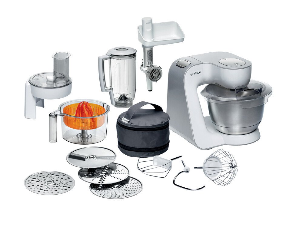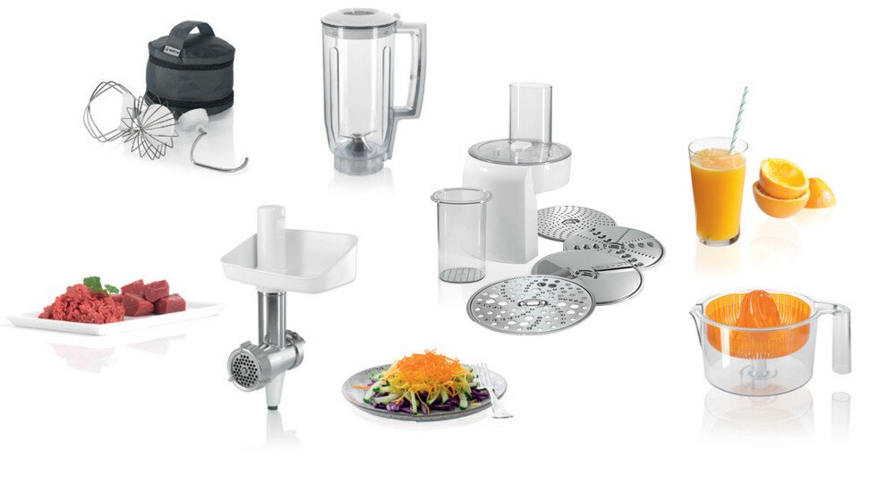 - Variabilní využití díky kvalitní sadě na míchání, hnětení a šlehání, průběhovému krouhači s kotouči na krouhání, strouhání a krájení, mixéru, masomlýnku a lisu na citrusy.