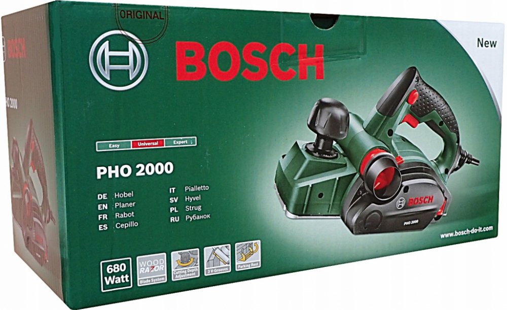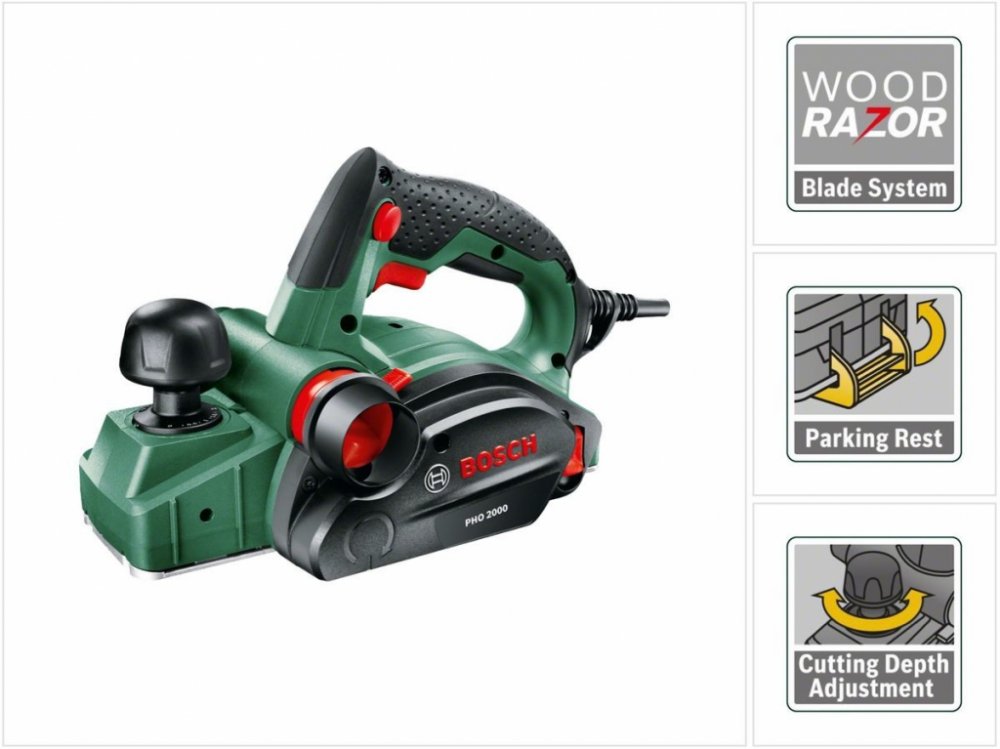 S ručním hoblíkem PHO 2000 od firmy Bosch bude práce nejen rychlejší, ale také přesnější. To je dáno především díky jeho vysokému úběrovému výkonu. Tento kompaktní stroj je poháněn silným 680 W motorem, a je tak vhodný pro náročné aplikace s hloubkou řezu až 2 mm. Patentovaný systém nožů Woodrazor umožňuje snadné hoblování bez námahy. Aby se zabránilo hromadění třísek, má tento ruční hoblík oboustranné vyhazování třísek s ventilátorem. V závislosti na pracovní situaci jsou třísky vyhazovány vpravo nebo vlevo s možností připojení prachového sáčku nebo vysavače. Kombinovaný ovladač a knoflík pro nastavení hloubky řezu zajišťuje bezpečné uchopení a plynule nastavitelnou hloubku řezu.
