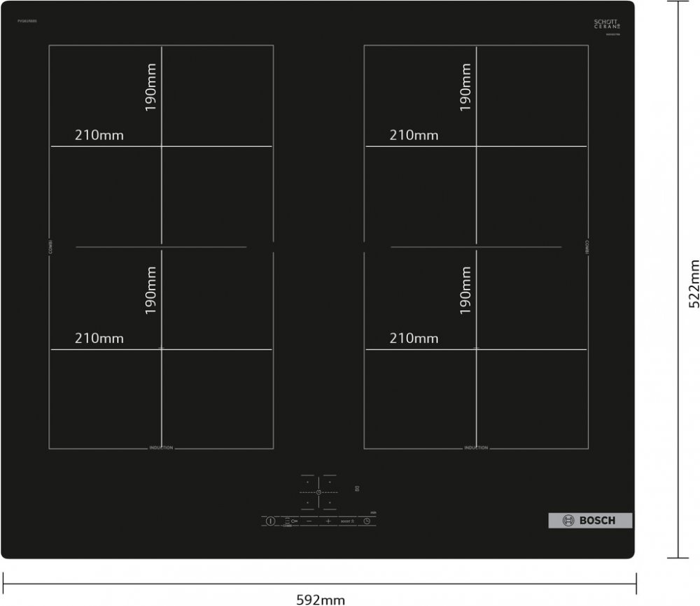 Bosch sklokeramické 13.3 kg 4 indukční dotykové černá 7400 W 220 - 240 V 50 / 60 Hz 5.1 x 59.2 x 52.2 cm 59.2 cm 52.2 cm 1.1 m