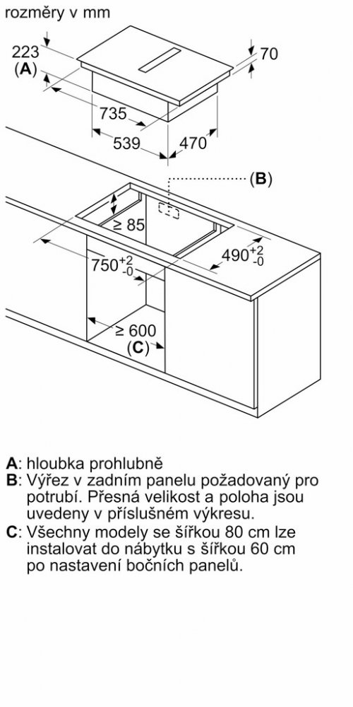 rozměry pro vestavbu (V x Š x H) : 223 x 750 x 490 - 490 mm