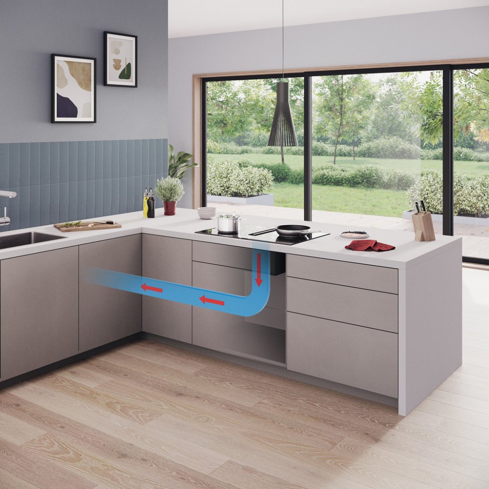 Varná deska s odsáváním umožňuje provoz s odvětráním nebo s recirkulací vzduchu. Součástí varné desky je instalační sada pro neřízenou recirkulaci vzduchu – čtyři pachové CleanAir filtry a adaptér pro odvod vzduchu. K dispozici je také velký výběr příslušenství pro další možnosti instalace, podrobnosti naleznete na webových stránkách nebo instalačních návodech.