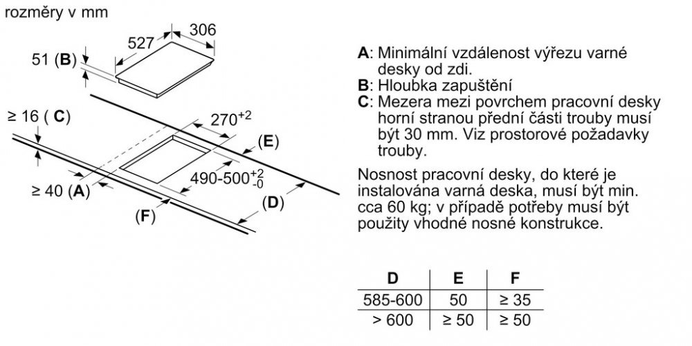 Rozměry varné desky Bosch jsou 5,1 × 30,6 × 52,7 cm (vך×h)