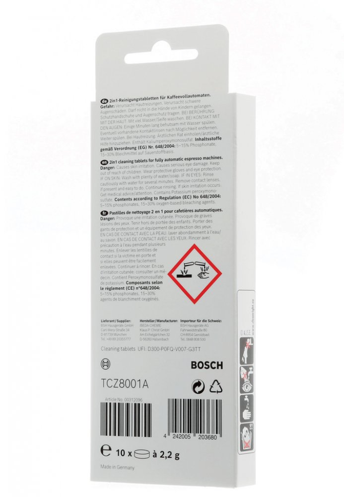 Bosch Siemens čisticí tablety TCZ8001 / 311969 + Bosch Siemens odvápňovací tablety TCZ8002 / 311864Sada na údržbu kávovaru Bosch SiemensÚdržba a čištění kávovaruKávovar je spotřebič, který vyžaduje pravidelnou údržbu a čištění. To zajistí, že naše káva bude mít stále dobrou chuť a že zapomeneme na poruchy zařízení. Čištění a odstraňování vodního kamene jsou nezbytné. S nabízenou sadou budete o svůj kávovar pečovat. Balení obsahuje *10 čisticích tablet 311969 a 6 odvápňovacích tablet 311864.Čištění kávovaru Siemens BoschČisticí tablety Bosch 311969 odstraňují mastné zbytky zrn a dalších nečistot z komponentů, hadic a vnitřku kávovaru. Zabraňují tak množení bakterií v kávovaru a udržují efektivnější provoz celého zařízení.Balení obsahuje 10 tablet, které vystačí na 10 čisticích cyklů. Četnost čištění závisí na tom, jak intenzivně je přístroj používán. Je však vhodné provádět čištění přibližně každé 2 měsíce nebo se řídit pokyny uvedenými na kávovaru.Čisticí tablety 311969 lze použít ve všech automatických kávovarech Bosch / Siemens. Jsou testované a jejich použití je bezpečné. Je důležité, abyste postupy čištění a odstraňování vodního kamene nepovažovali za zaměnitelné. Každé z nich působí na jiné znečištění a odstraňuje jiné látky. Aby Váš přístroj fungoval dlouho a efektivně, měli byste kávovar pravidelně čistit a odvápňovat.Odstraňování vodního kamene z kávovaru Bosch SiemensBosch / Siemens TCZ8002 odvápňovací tablety 2v1 odstraňují vodní kámen a chrání proti korozi kávovary, rychlovarné konvice a ohřívače vody. Pravidelným používáním tablet zlepšujete funkci a prodlužujete životnost Vašeho přístroje. S nabízeným odvápňovačem se o svůj kávovar postaráte.Balení obsahuje 6 tablet , které vystačí na 3 odvápňovací cykly (na jeden cyklus odvápnění jsou potřeba dvě tabl.).Bezpečnostní zdroje Bosch, Siemens BSH Hausgeräte GmbH. Carl-Wery-Str. 34 81739 MünchenTel.: +420 261 300 482 E-mail: shop@cz.bosch.comsummary::-webkit-details-marker { display: none; } summary::marker { display: none; }
