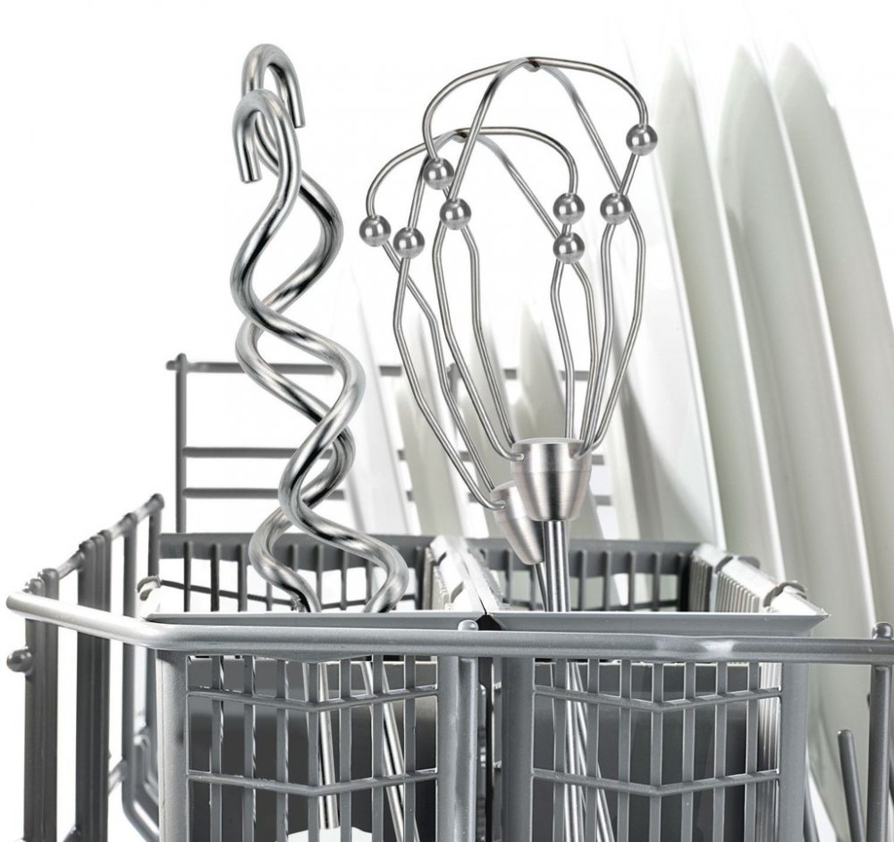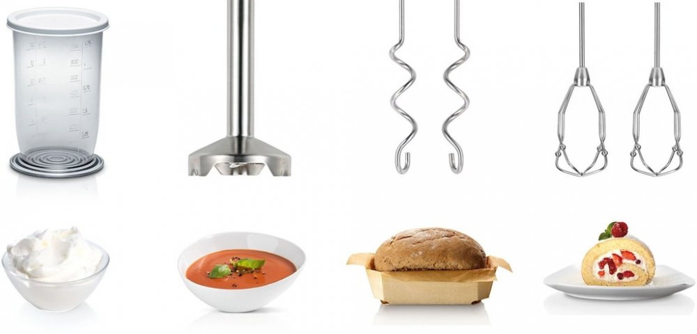 včetně příslušenství 2 x víko, 1 x odměrná mixovací nádobka, 1 x nerezová mixovací noha, 2 x míchací / šlehací metla, 1 x univerzální drtič