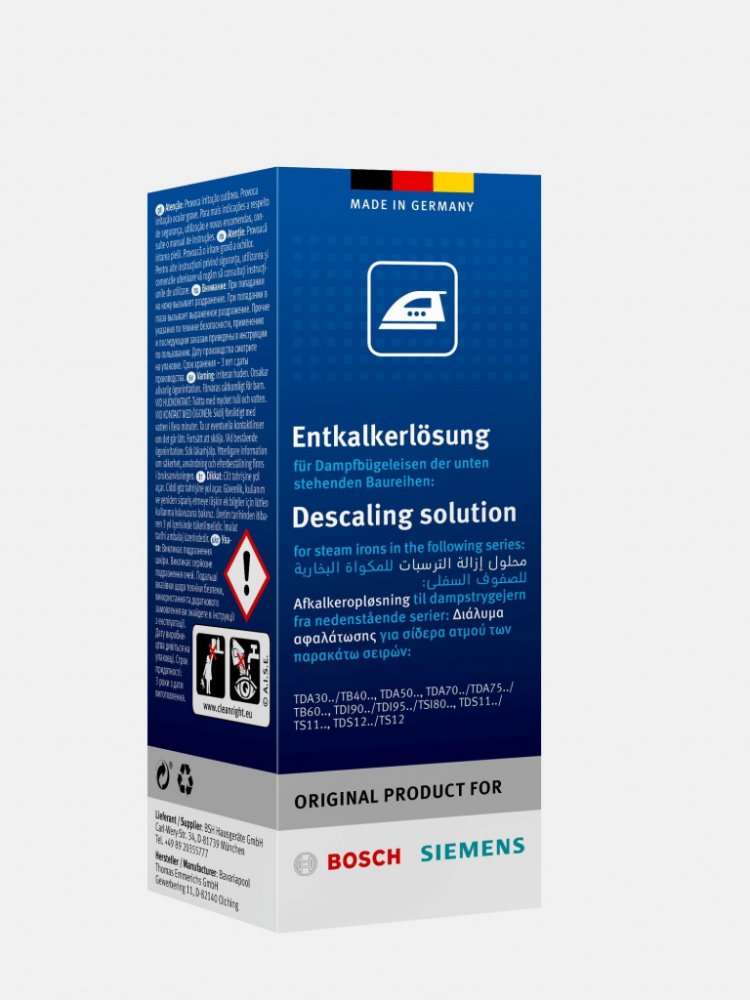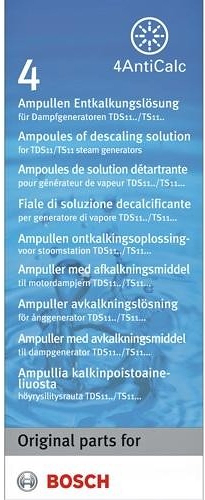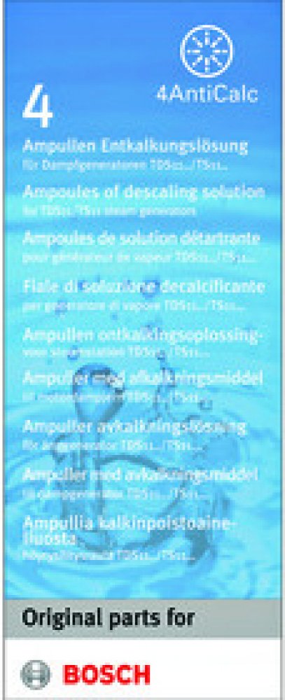 Bosch TDZ1101 odvápňovací tekutina pro parní generátory V balení 4 ampulky po 25 ml Odvápňujicí tekutina je určena pro parní generátory. V balení naleznete čtyři ampulky po 25 mililitrech. S využitím odvápňovací tekutiny bude váš parní generátor čistý a připravený pro další použití. nahrada 00311972