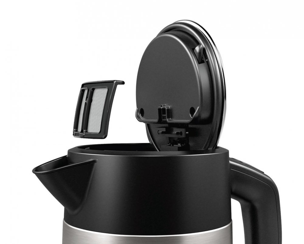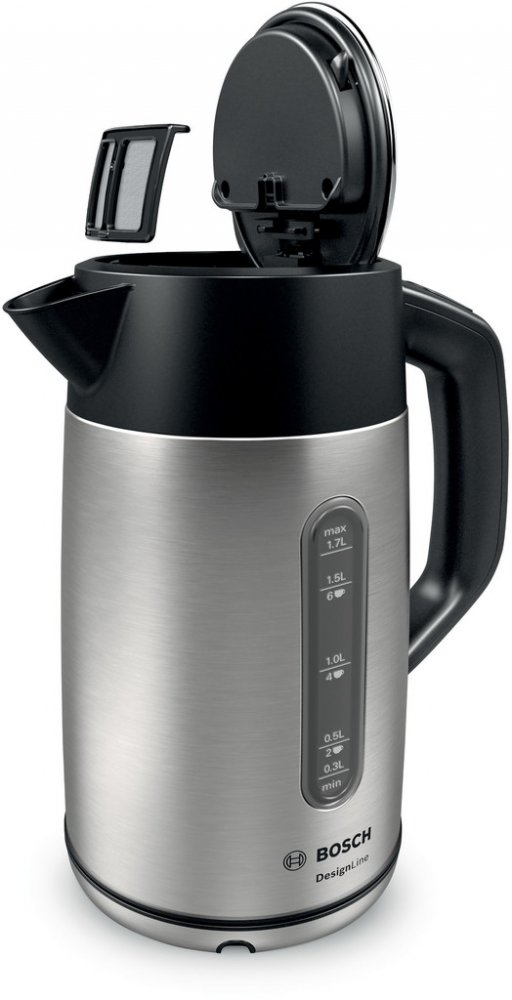 Varná konvice TWK4P440 od firmy Bosch je vybavena vyjímatelným nerezovým filtrem. Základna konvice je také z nerezu a skrývá topné těleso.