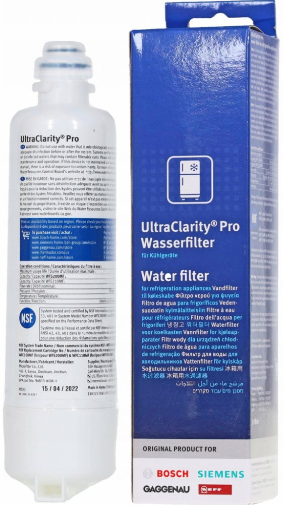 Vodní filtr UltraClarity Pro je originální příslušenství navržené pro chladničky Bosch a Siemens. Tento filtr zajišťuje optimální kvalitu vody, odstraňuje nečistoty a snižuje obsah chlóru, což zlepšuje chuť vody a ledu.