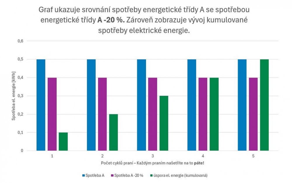 o 20 % účinnější (40 kWh/100 cyklů) než mezní hodnota (50 kWh/100 cyklů) třídy energetické účinnosti A podle delegovaného nařízení EU 2019/2014