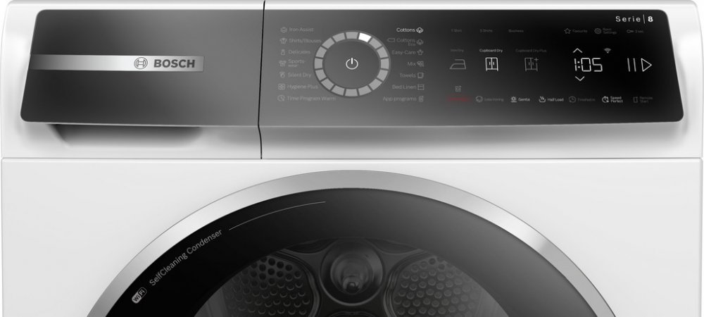 speciální programy: další programy přes aplikaci, bavlna, ložní prádlo, košile/halenky, bavlna eco, jemné, ručníky, Hygiena Plus, Iron Assist: parní program, který redukuje pomačkání suchého oblečení, mix, tiché sušení, sport/fitness, snadno udržovatelné, časový program teplý