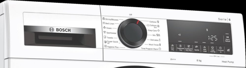 - TouchControl tlačítka – odložení konce programu, snadné žehlení, šetrný, akustický signál, suché k žehlení, suché do skříně, extra suché do skříně, poloviční náplň, start/reload/ pauza, odložení startu až o 24 hod.