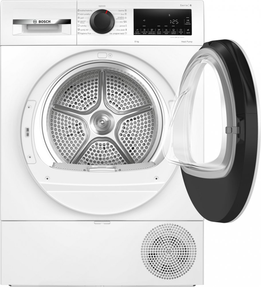 Sušička prádla, kapacita 8 kg, s tepelným čerpadlem, energetická třída C, hlučnost 63 dB, EasyClean filtr, Auto Dry, možnost polovičního naplnění sušičky, program ložní prádlo s bubnem otáčejícím se na obě strany