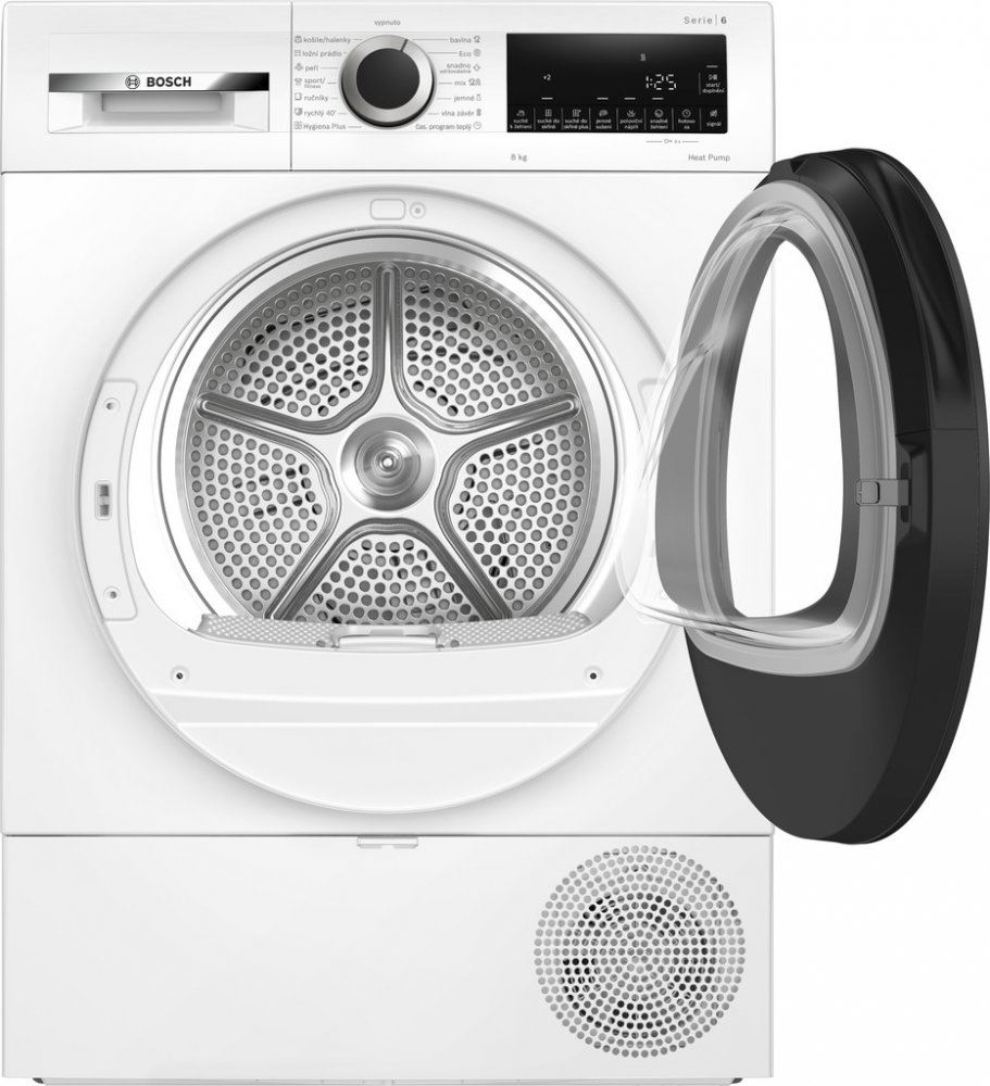 Sušička prádla, kapacita 8 kg, kondenzační s tepelným čerpadlem, energetická třída C, hlučnost 63 dB, EasyClean filtr, Auto Dry, Program ložní prádlo, poloviční náplň, cyklus načechrávání, TouchControl tlačítka
