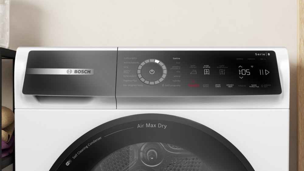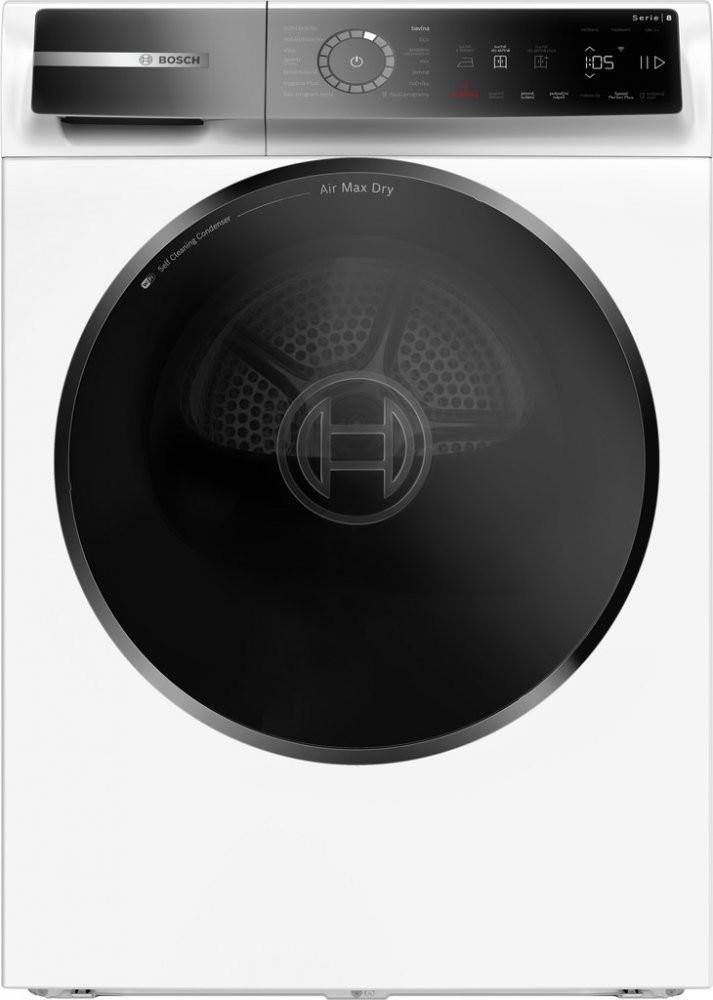 Bosch volně stojící kondenzační 9 kg A pro 3–4 osoby s odvodem do odpadu pro tiché večerní použití (pod 62 dB) 57 dB 79 kWh 79 kWh A 265 min A 84.2 cm 59.8 cm 62.7 cm 56 kg 13 pouze dotykové ovládání